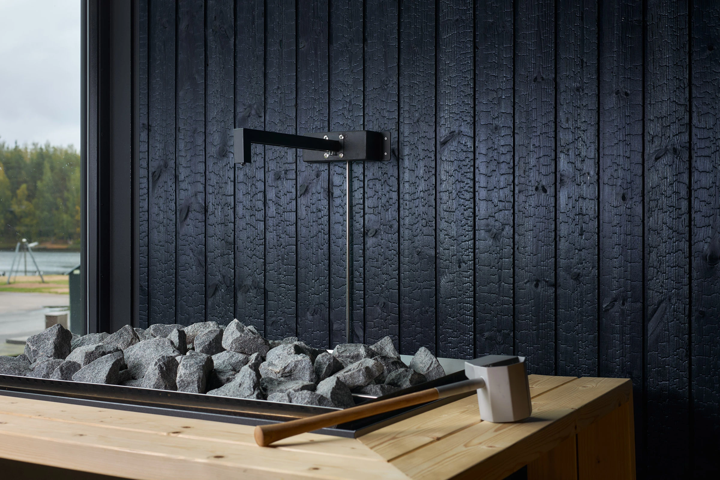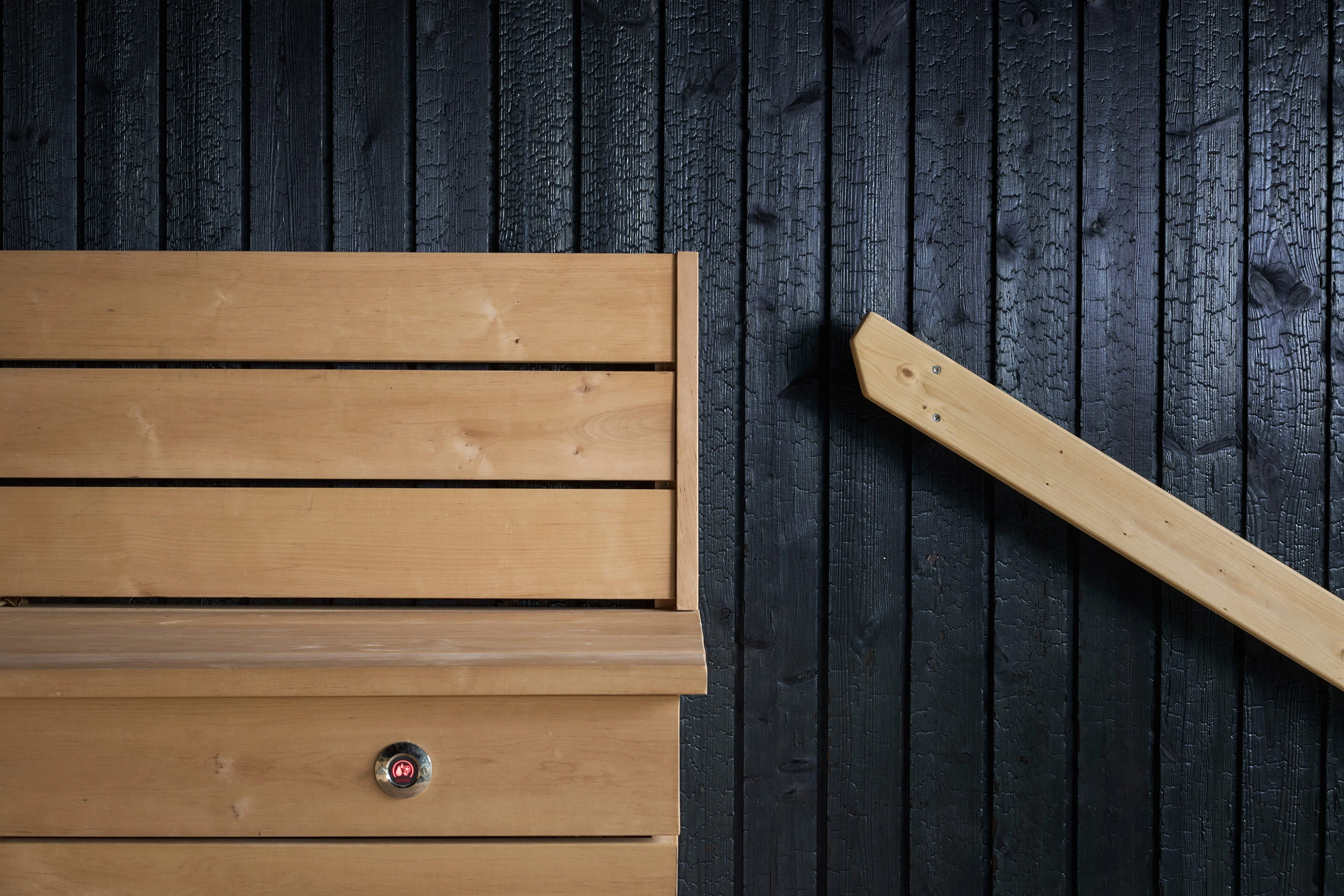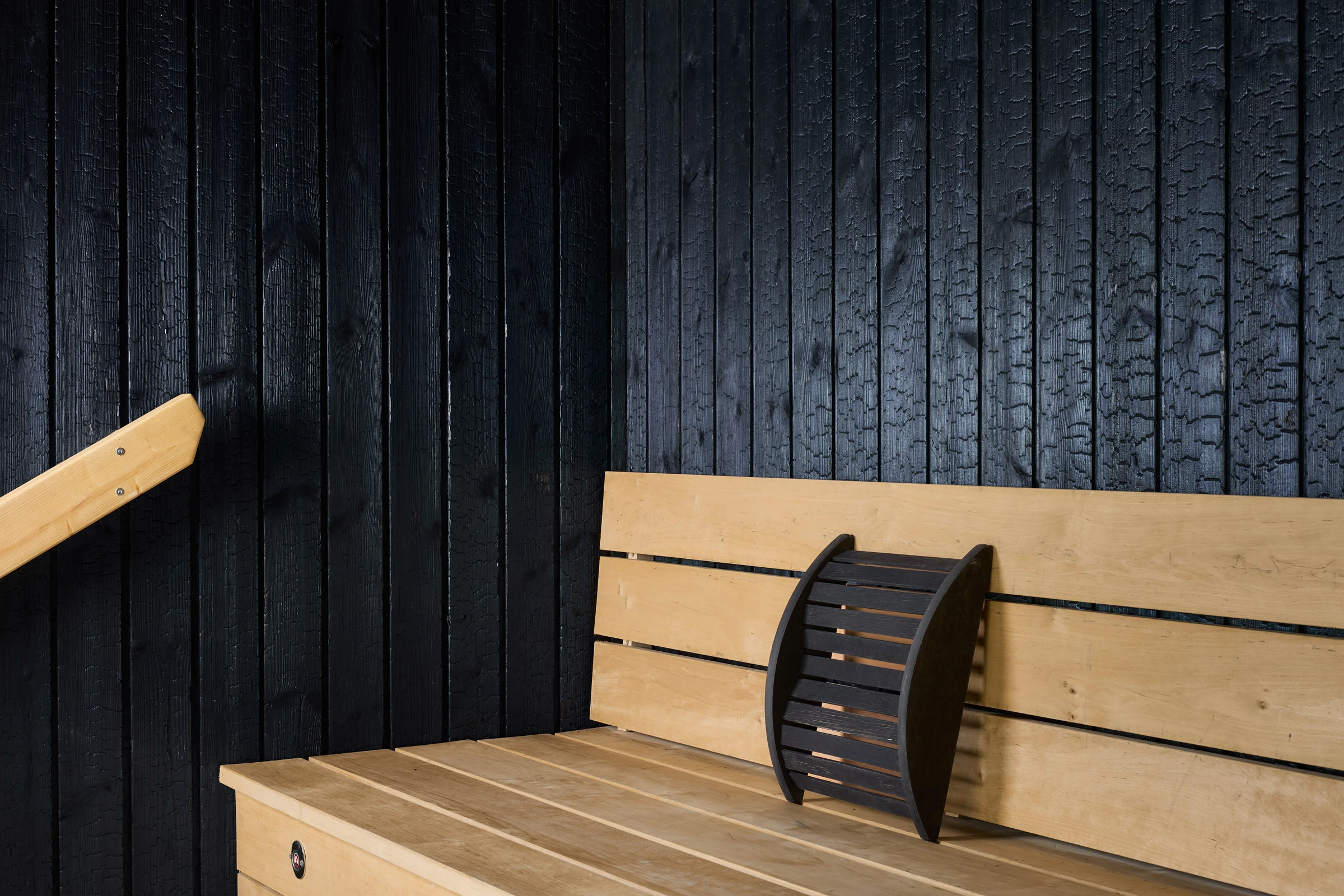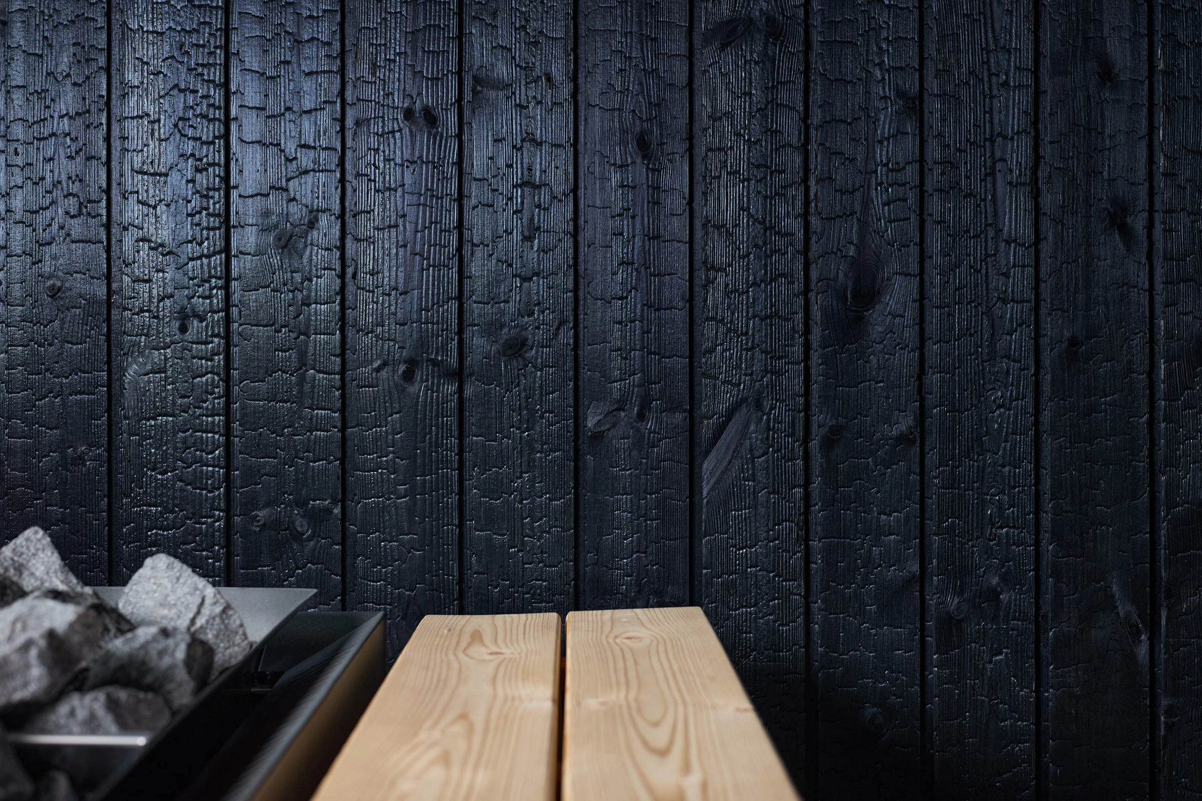 Julkisessa saunassa materiaalilta vaaditaan paljon. Kosteus, kuumuus ja toistuva käyttö eivät anna armoa, joten pintojen pitää kestää ja tuntua hyvältä myös läheltä. Hiilletty puu sopii tähän ympäristöön luontevasti, koska se on luonnollinen ja rauhallinen materiaali. Pinta tuo tilaan estetiikkaa, joka tuntuu aidolta ja maanläheiseltä, vaikka sävyssä onkin omanlaisensa poikkeava hohde.