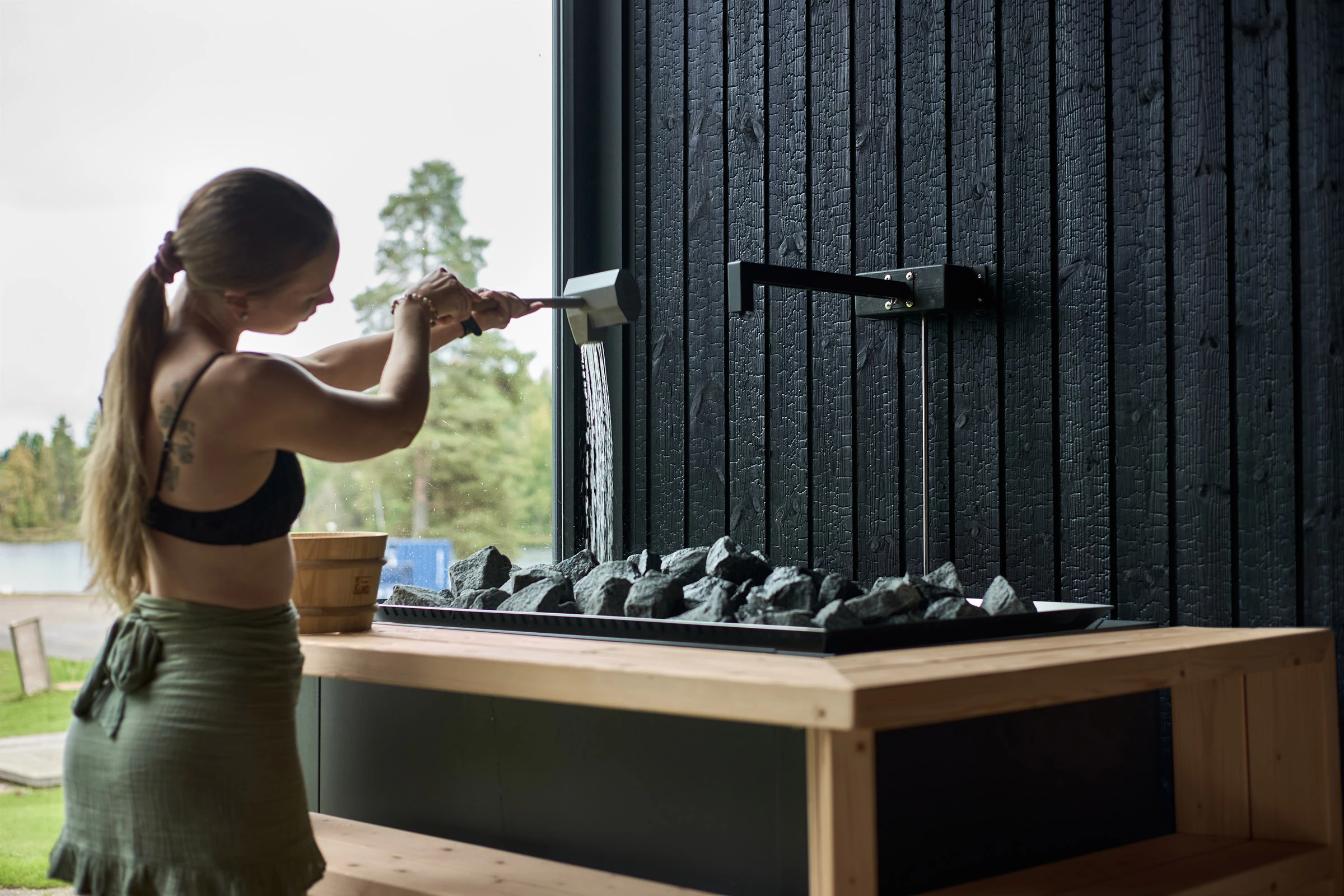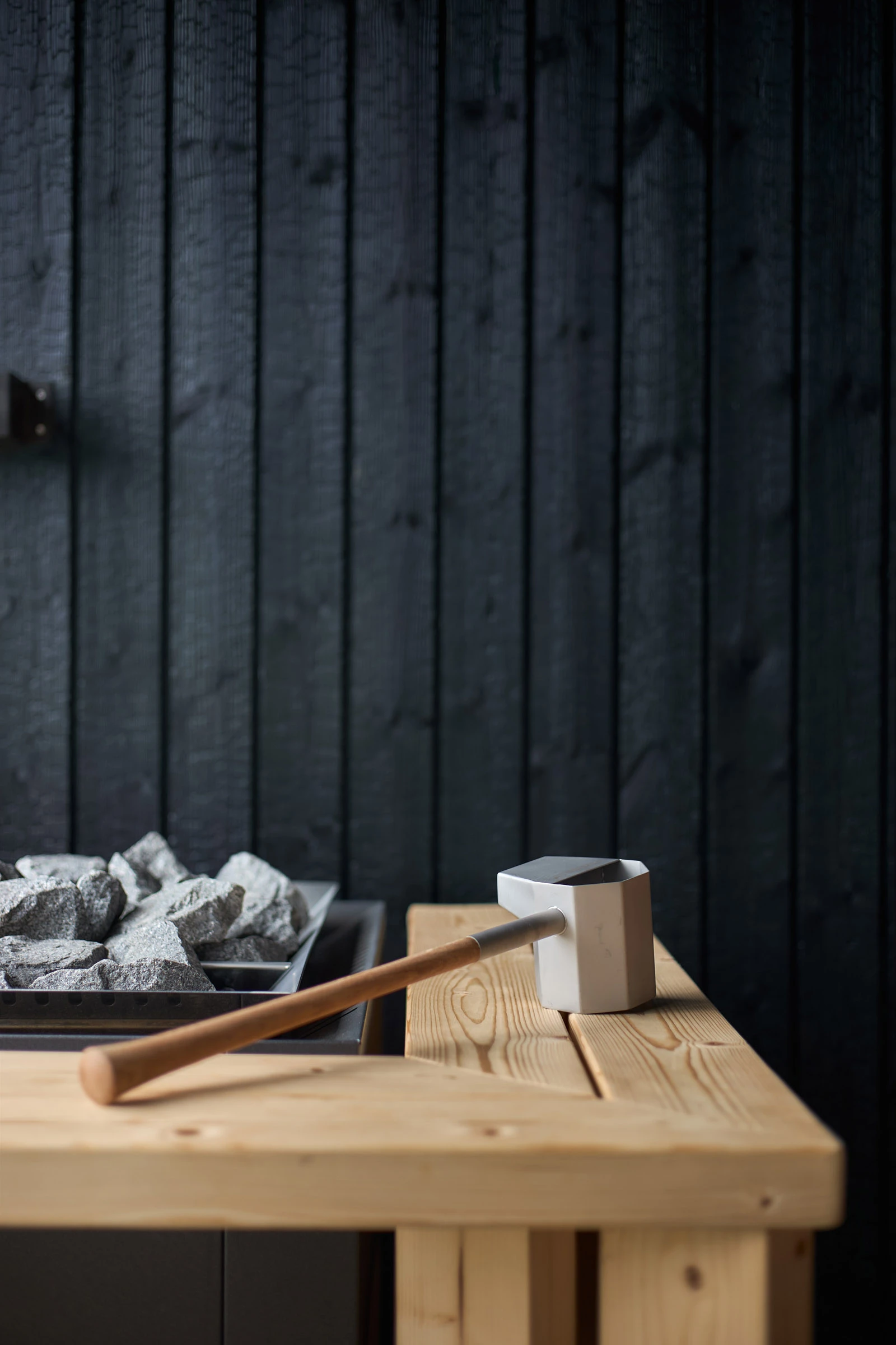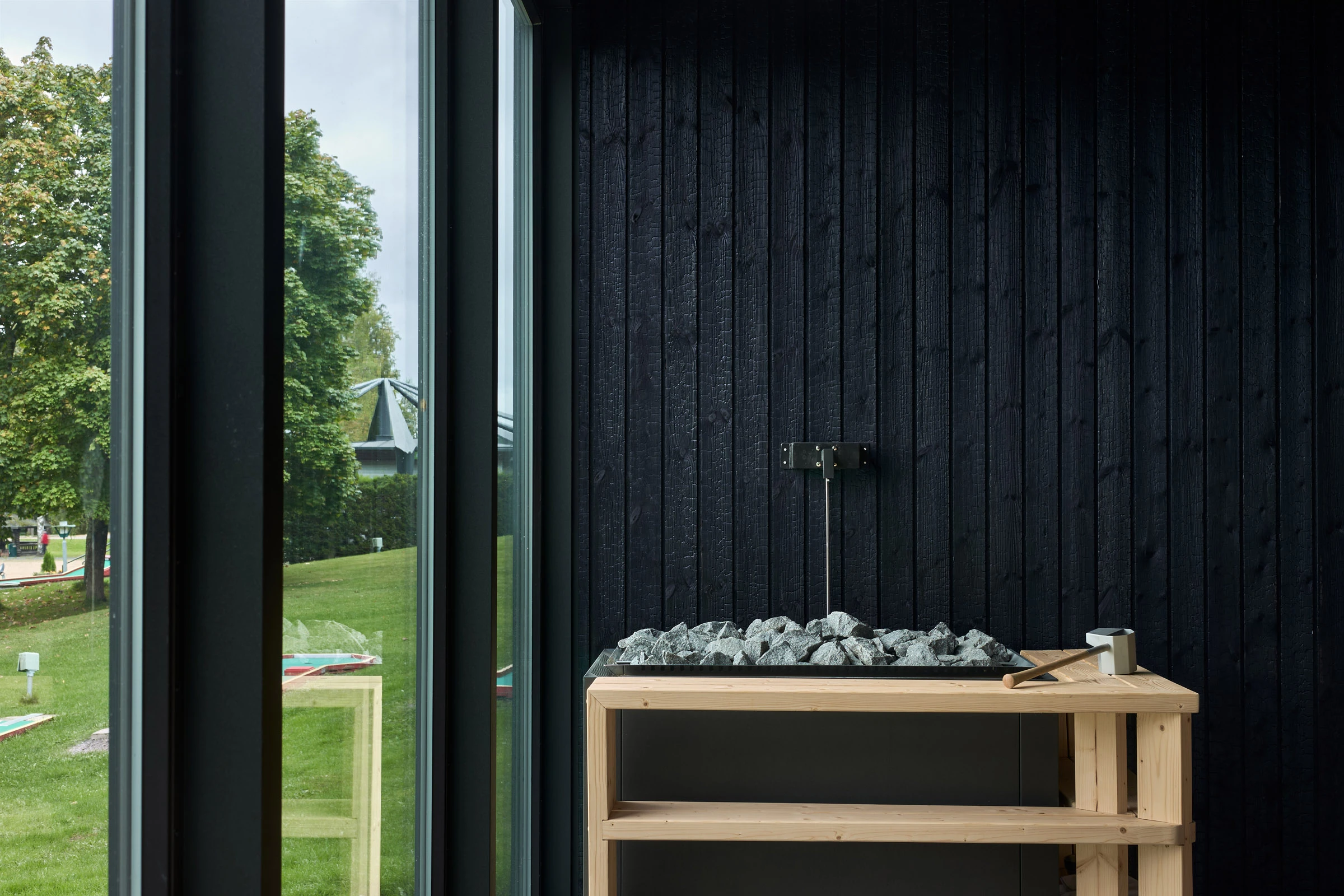 Julkisessa saunassa materiaalilta vaaditaan paljon. Kosteus, kuumuus ja toistuva käyttö eivät anna armoa, joten pintojen pitää kestää ja tuntua hyvältä myös läheltä. Hiilletty puu sopii tähän ympäristöön luontevasti, koska se on luonnollinen ja rauhallinen materiaali. Pinta tuo tilaan estetiikkaa, joka tuntuu aidolta ja maanläheiseltä, vaikka sävyssä onkin omanlaisensa poikkeava hohde.