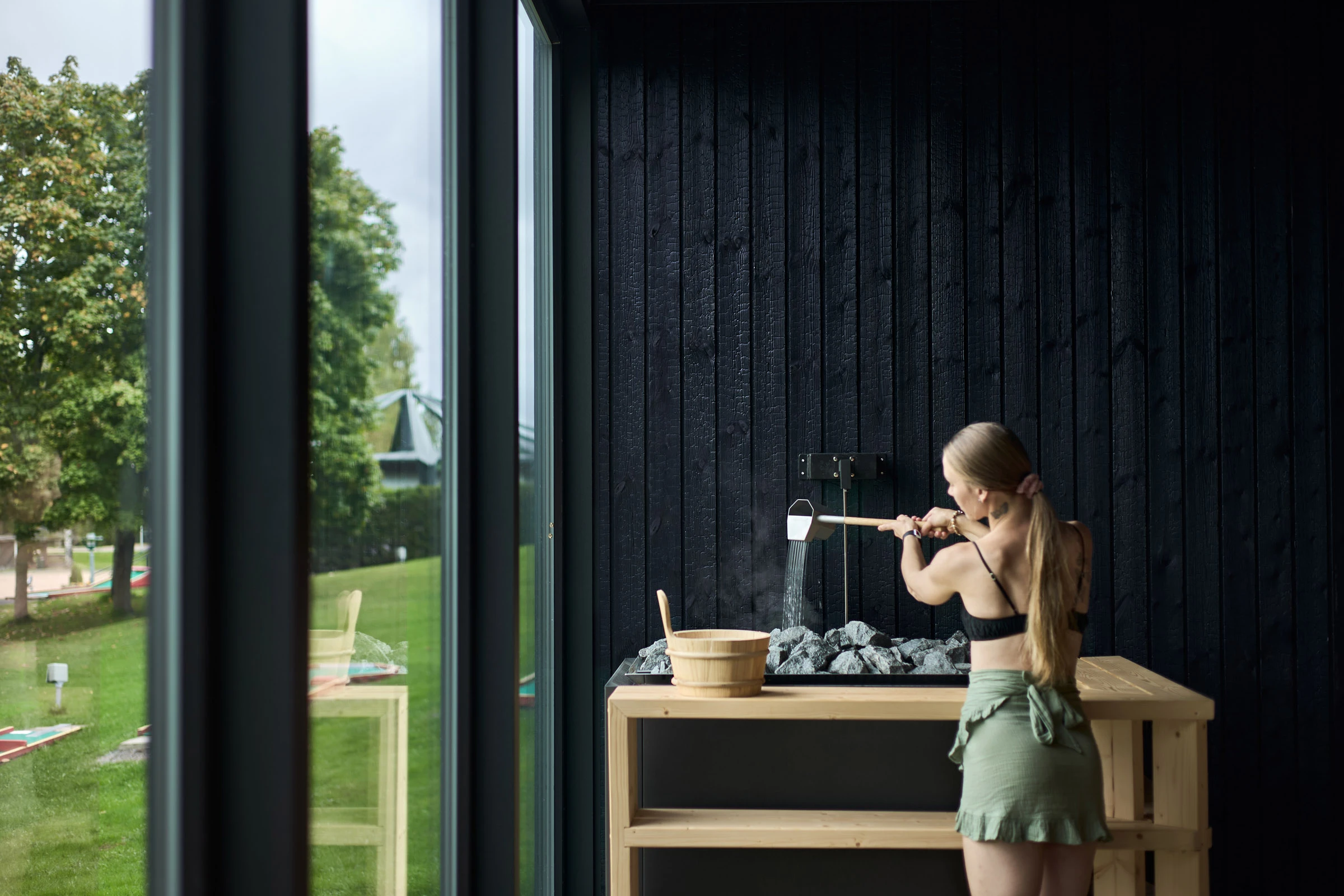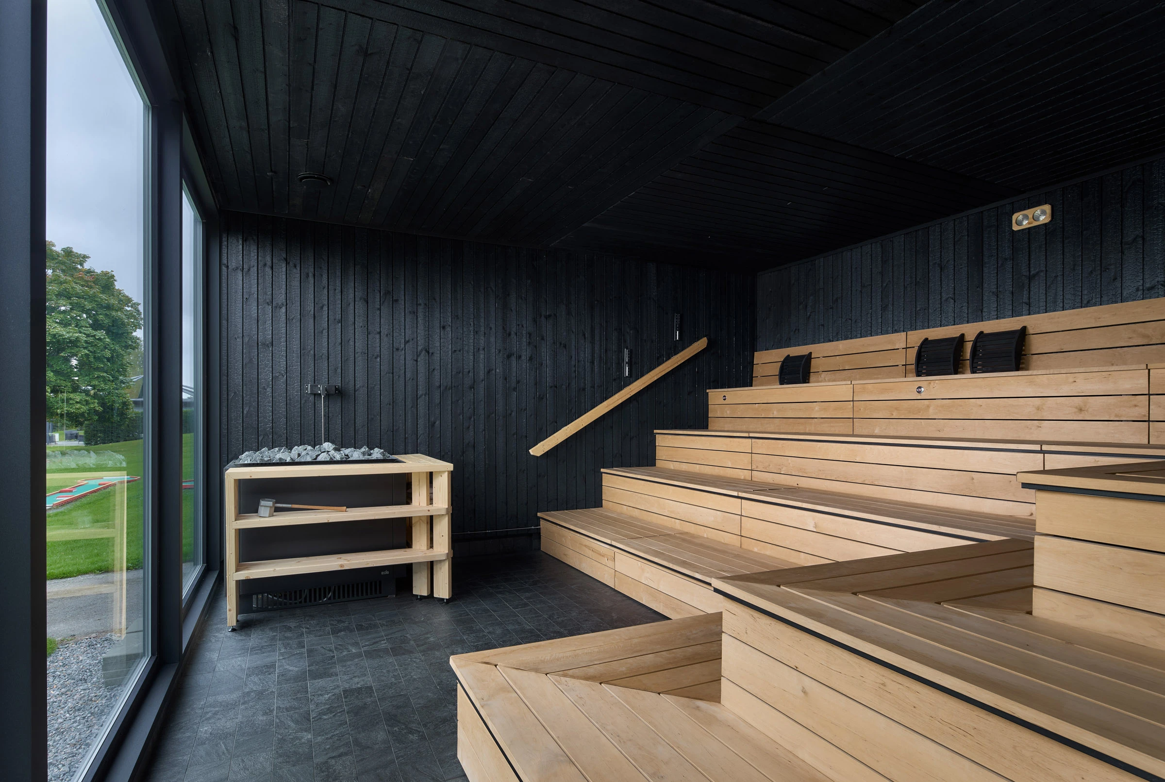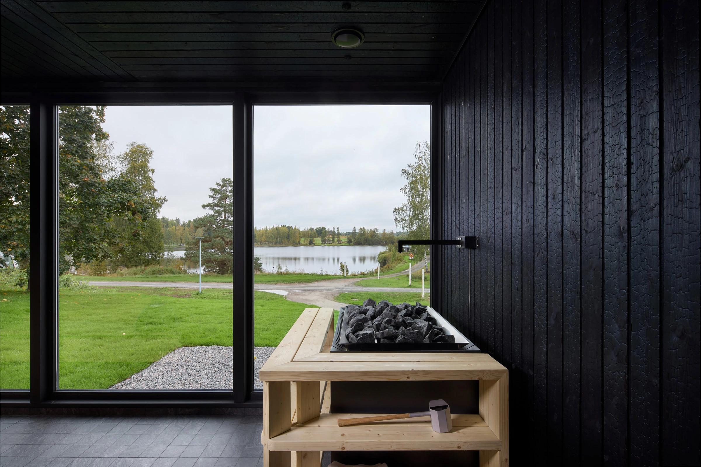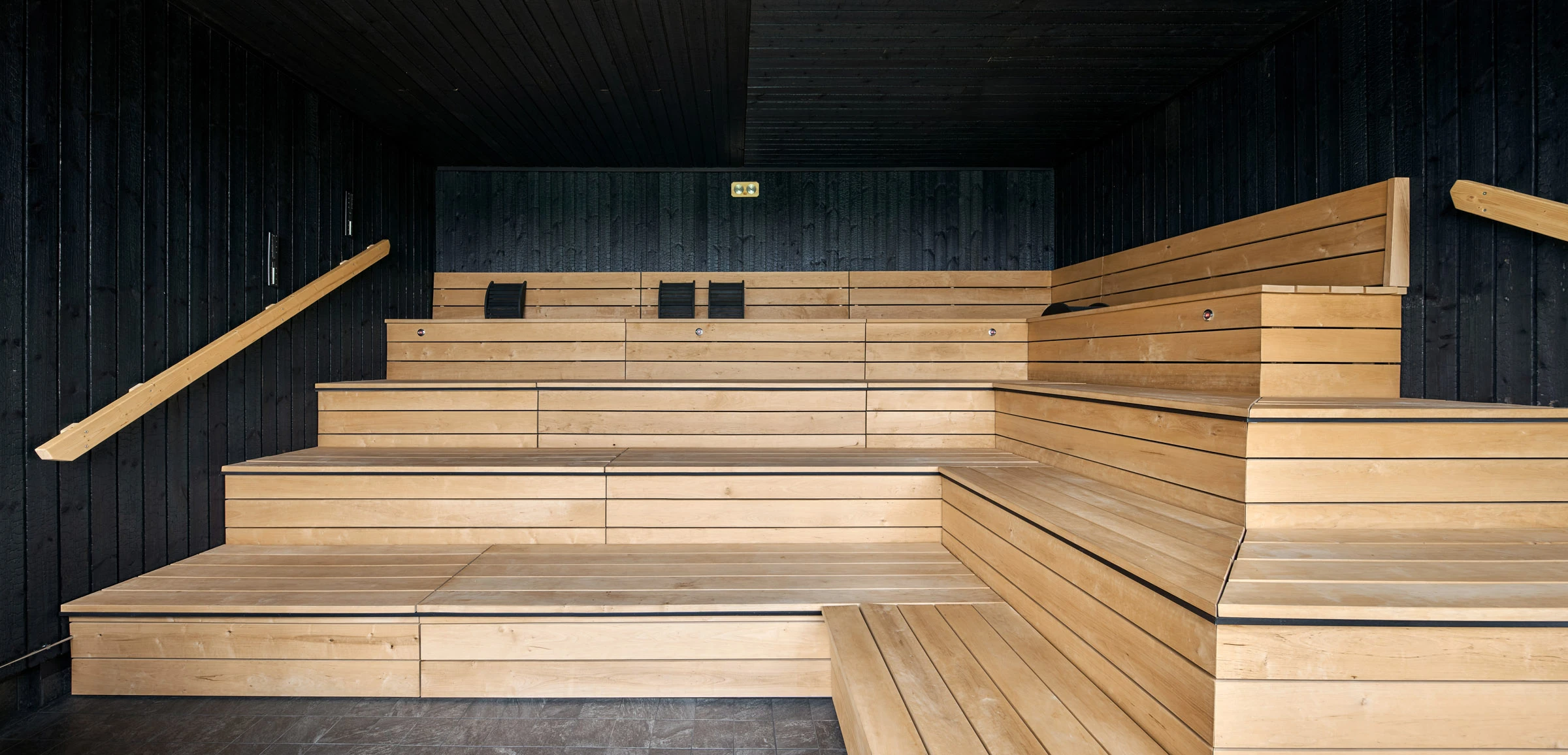 Julkisessa saunassa materiaalilta vaaditaan paljon. Kosteus, kuumuus ja toistuva käyttö eivät anna armoa, joten pintojen pitää kestää ja tuntua hyvältä myös läheltä. Hiilletty puu sopii tähän ympäristöön luontevasti, koska se on luonnollinen ja rauhallinen materiaali. Pinta tuo tilaan estetiikkaa, joka tuntuu aidolta ja maanläheiseltä, vaikka sävyssä onkin omanlaisensa poikkeava hohde.