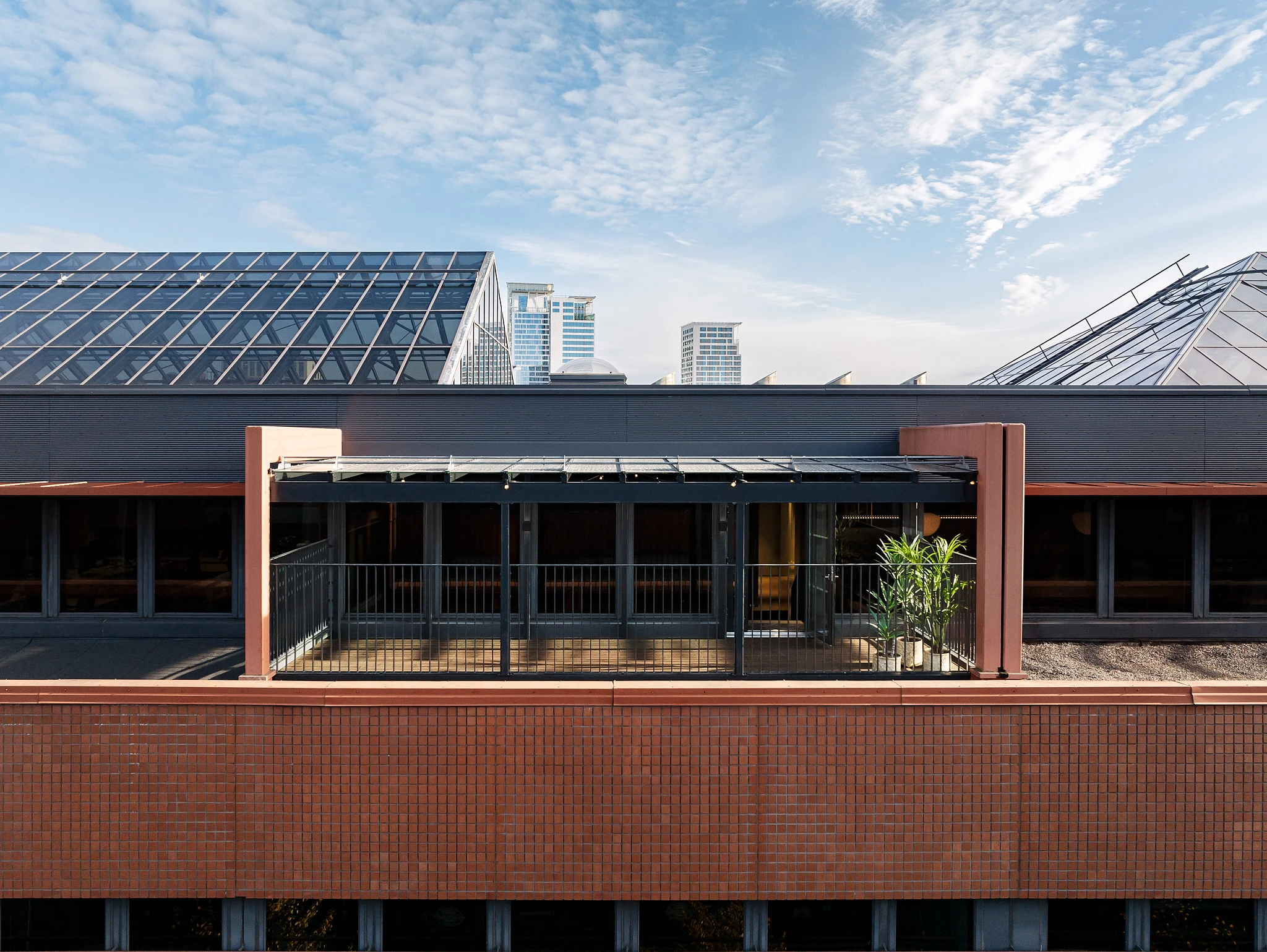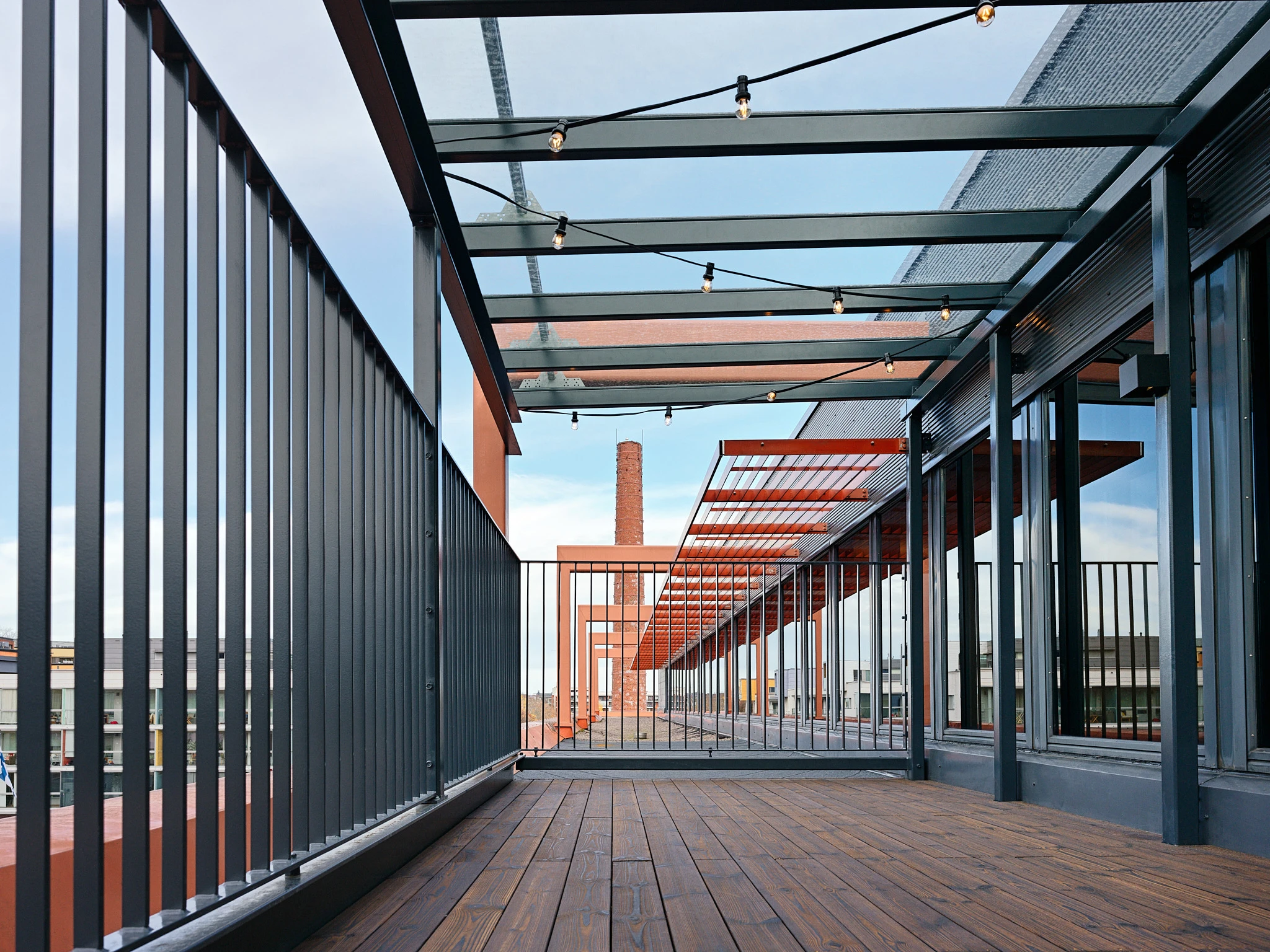 Meidän osuutemme kokonaisuudessa löytyi katolta. Hiil toimitti kohteeseen kattoterassin terassilaudat, joissa valittiin pinnaksi Kaarna. Kaarna on hiilletty ja harjattu pinta, joka on öljytty kirkkaalla öljyllä. Se tuntuu jalalle miellyttävältä ja näyttää elävältä, koska harjaus nostaa puun syyt ja hiillytyksen jäljen esiin hallitusti.