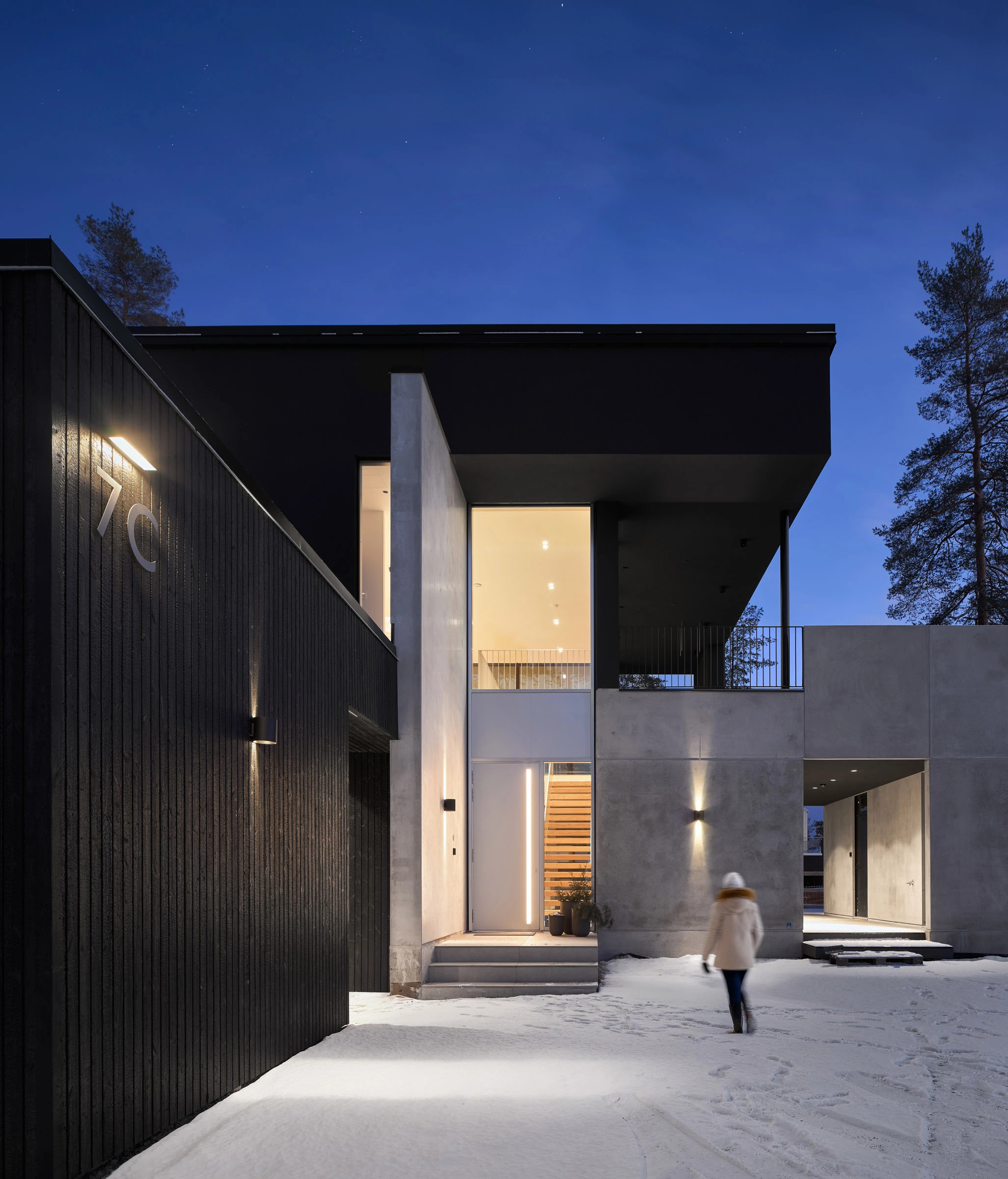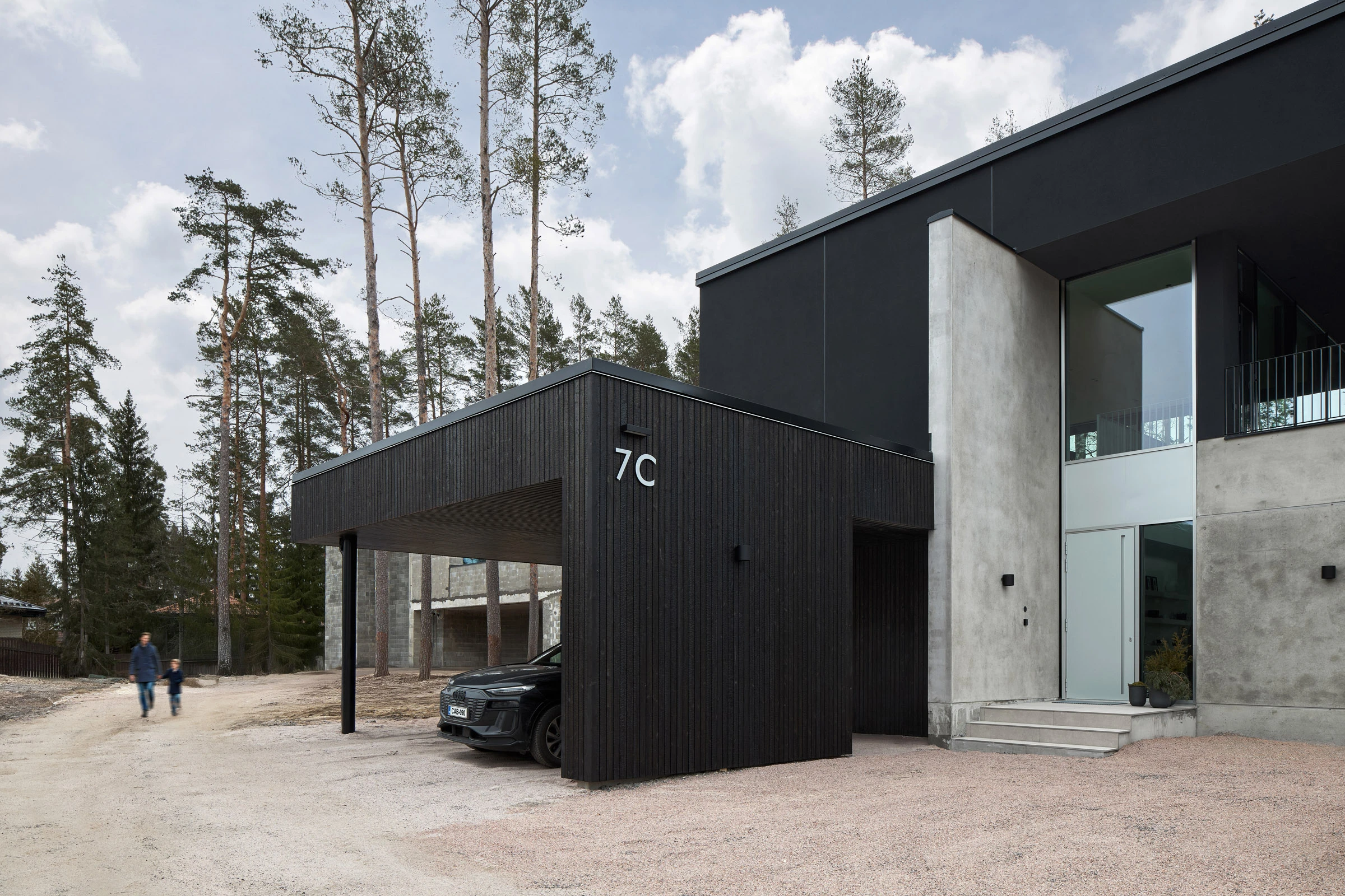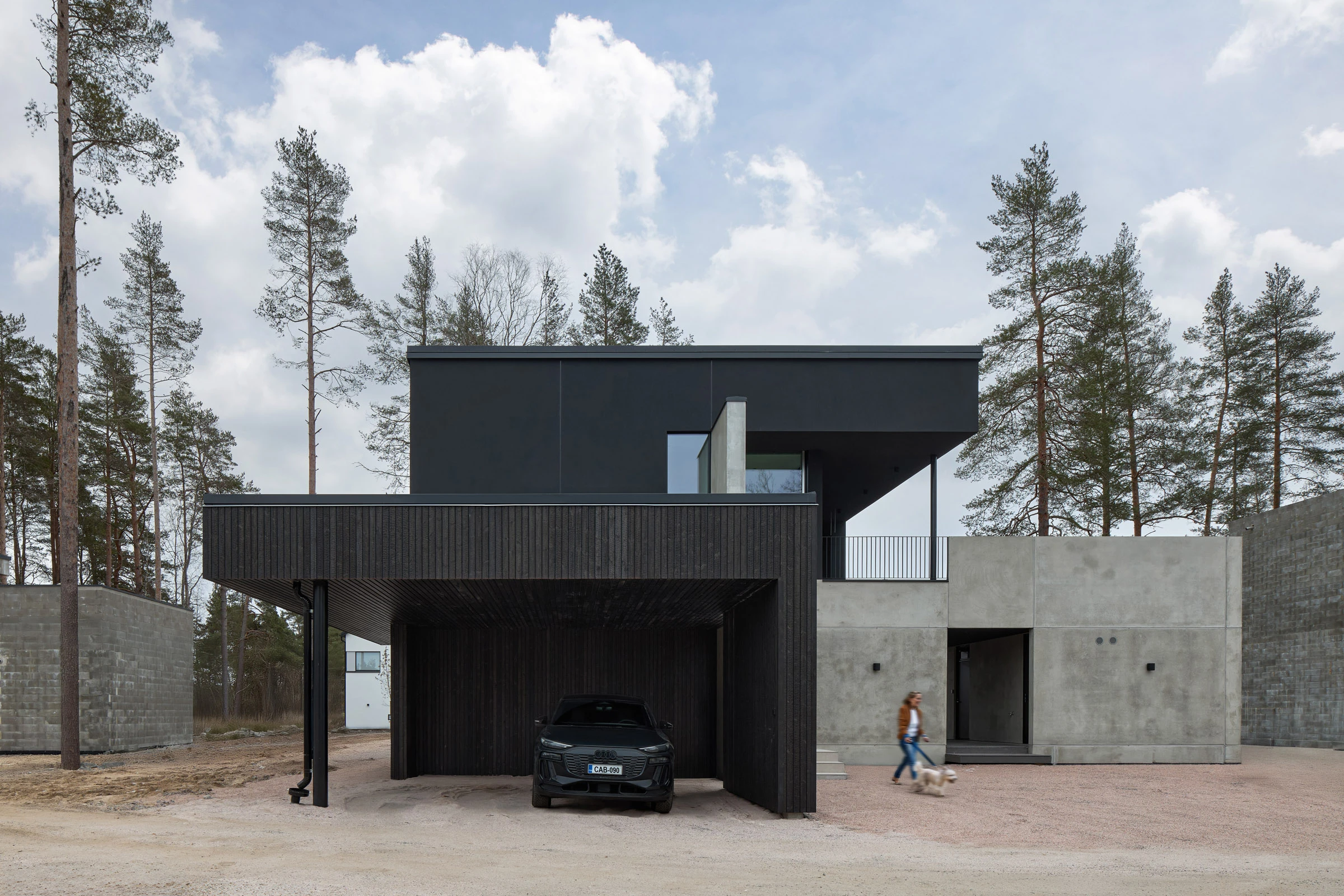 Tässä kodissa kokonaisuus on selvästi mietitty. Selkeät massat, betoni ja suuret lasipinnat tekevät talosta rauhallisen ja modernin. Autokatos liittyy rakennukseen kuin oma siipensä, ja sen hiilletty, musta puuverhous kerää katseen juuri sopivasti. Ilta- ja talvivalossa pinta näyttää syvältä ja pehmeältä, ja ympäröivät vanhat männyt sitovat rakennuksen osaksi maisemaa.