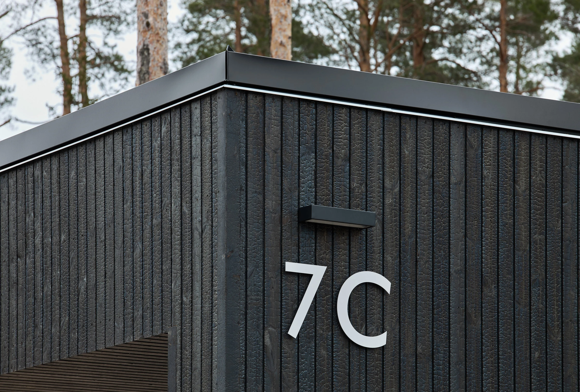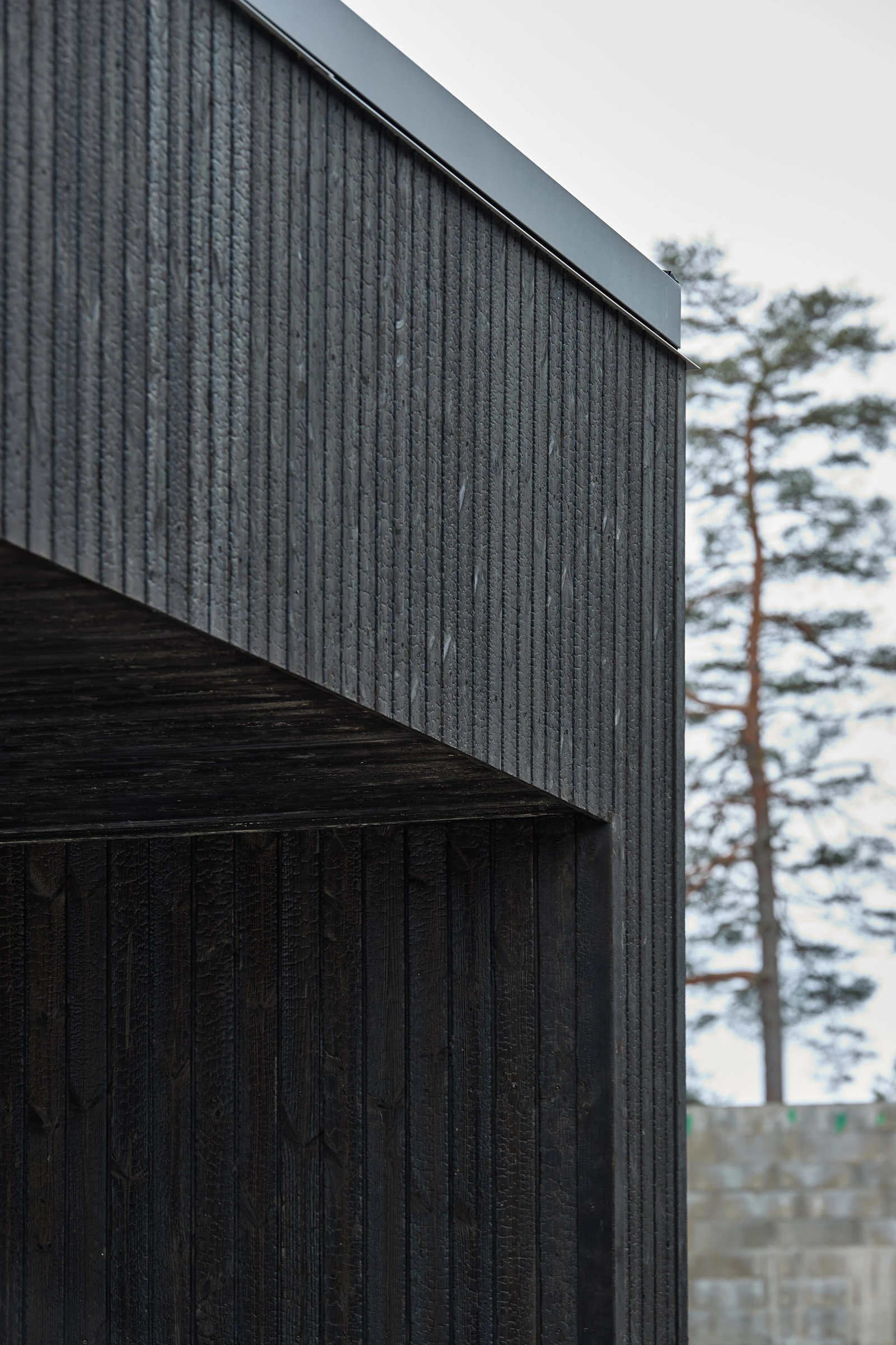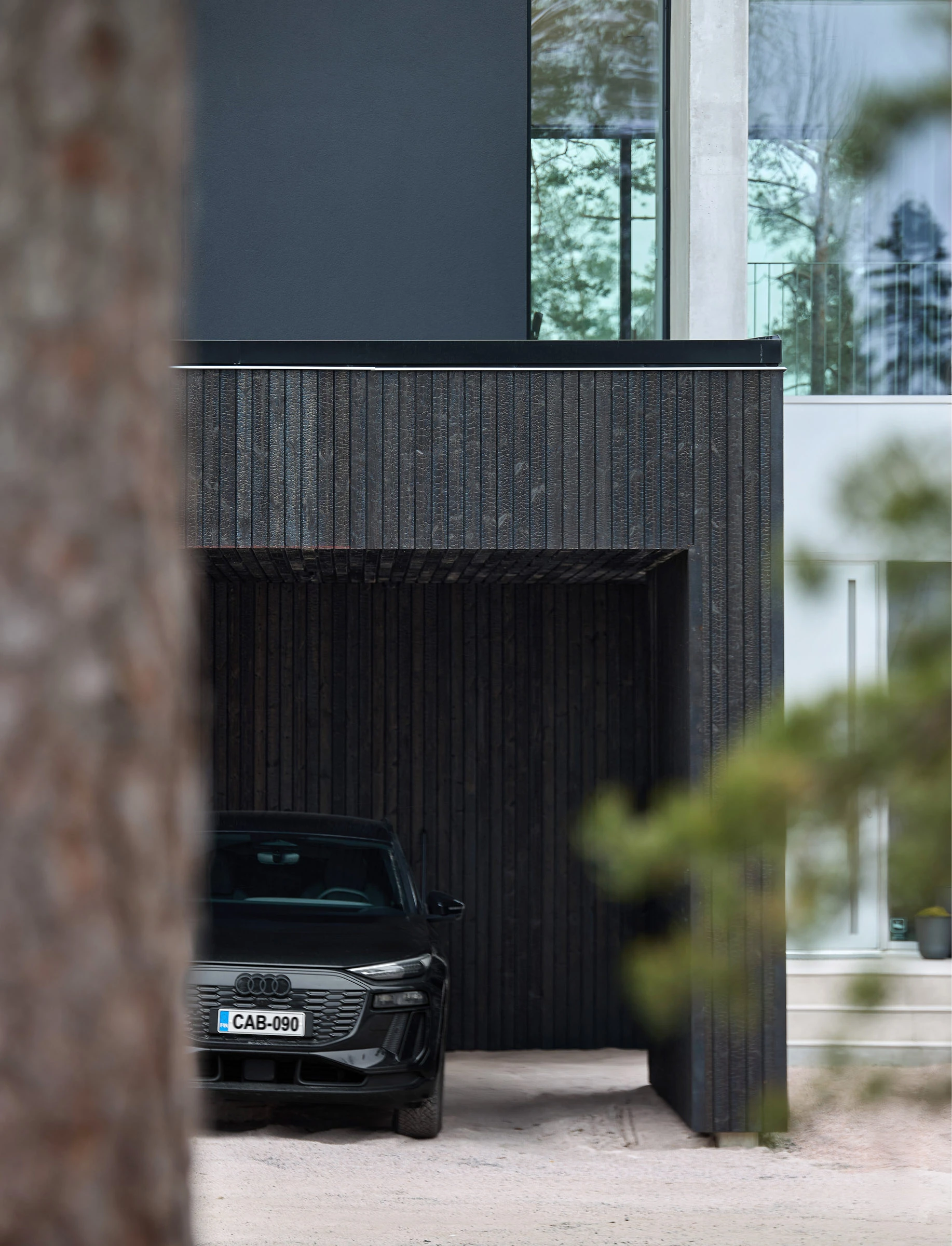 Autokatoksen verhoukseen oli alun perin harkittu hiillettyä Accoyaa, mutta kun kotimainen vaihtoehto löytyi, suunnitelma vaihtui hiillettyyn suomalaiseen mäntyyn. Ajatus tuntuu luontevalta juuri tässä pihapiirissä, koska taloa kehystävät ylväät männyt. Verhouksesta tuli osa tarinaa, ei irrallinen pintapäätös.