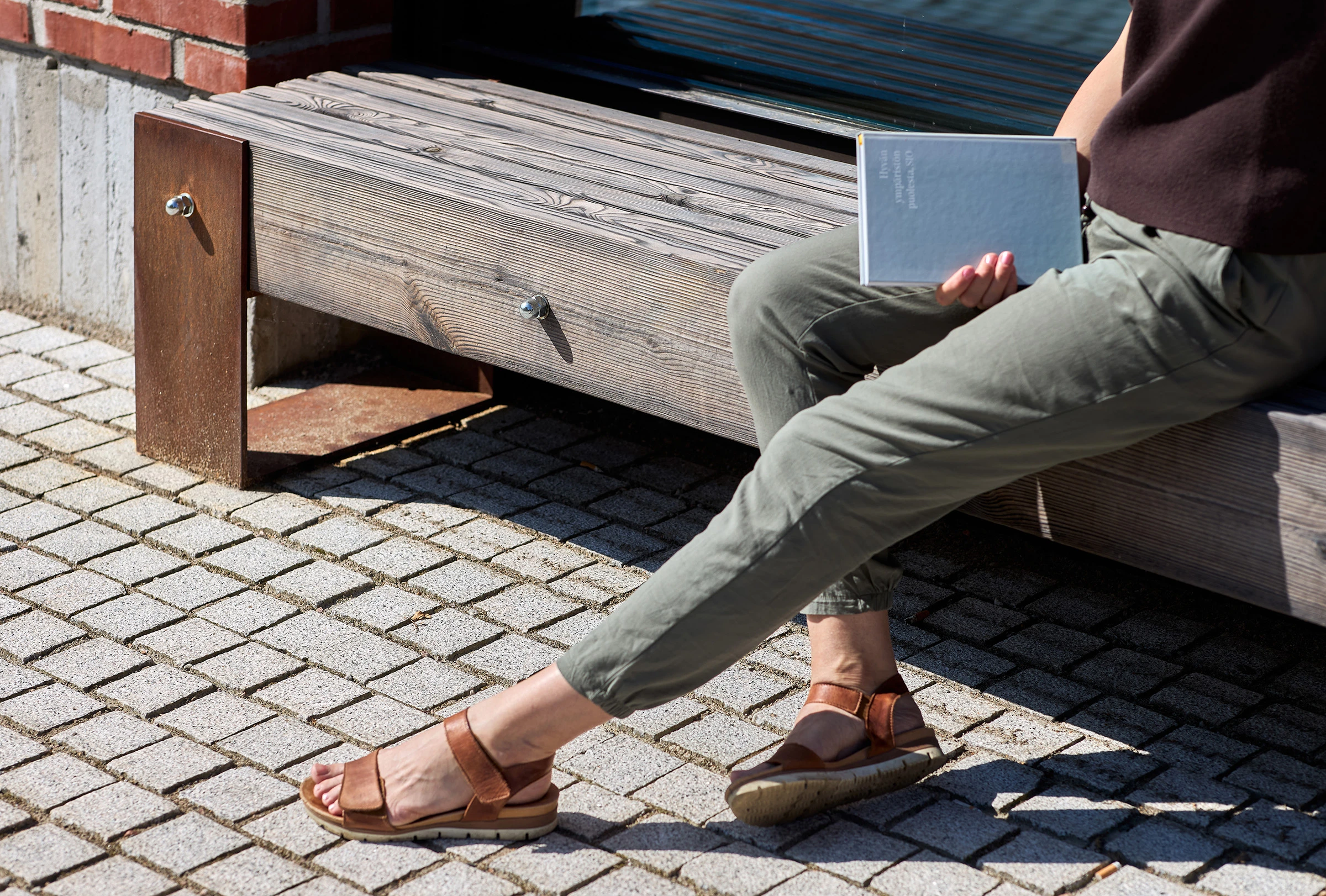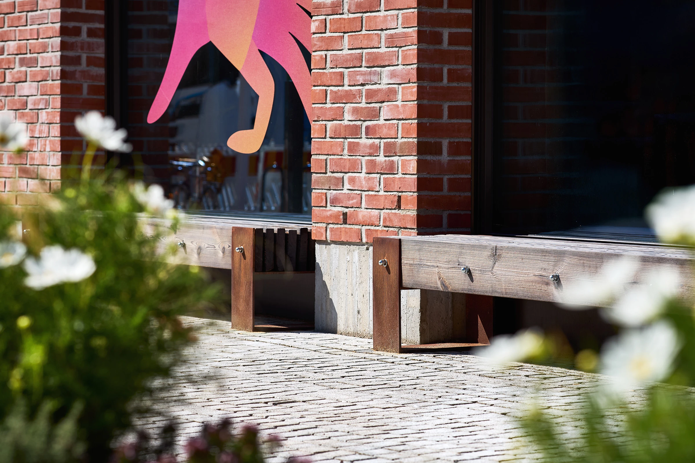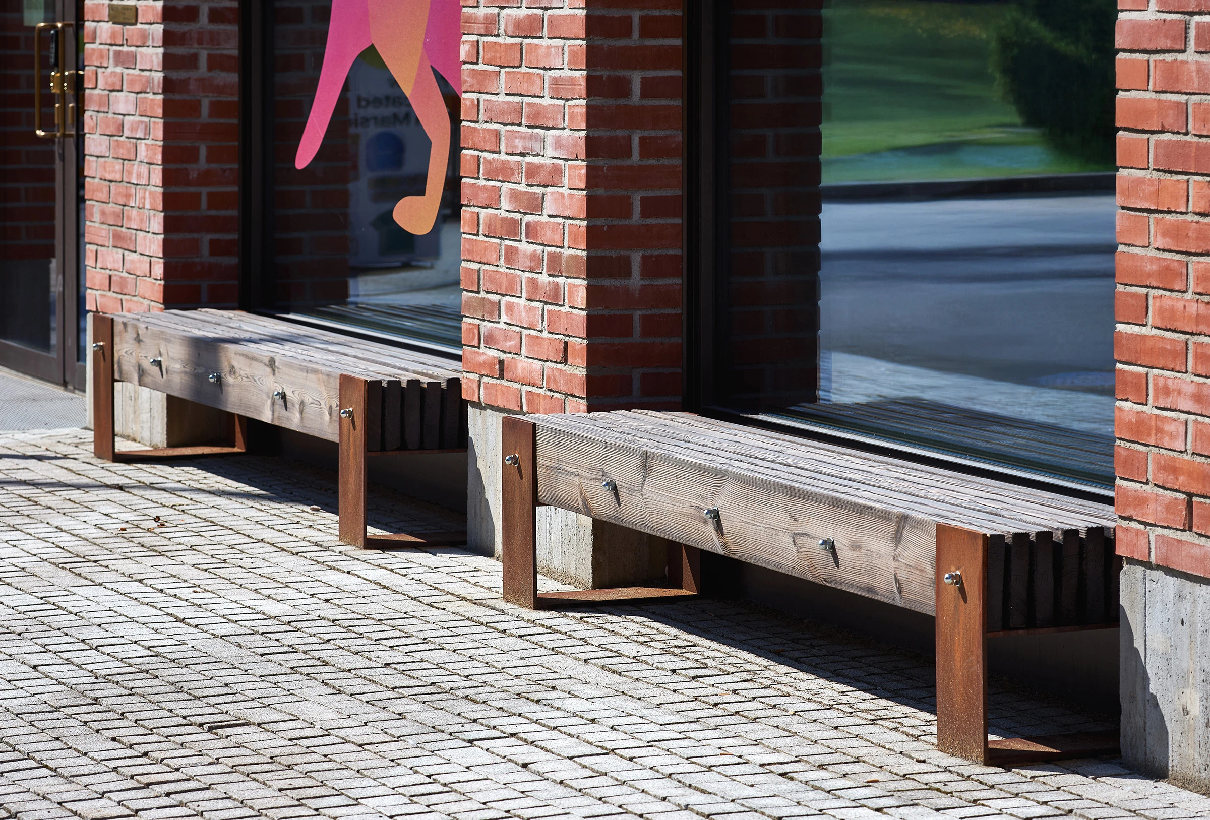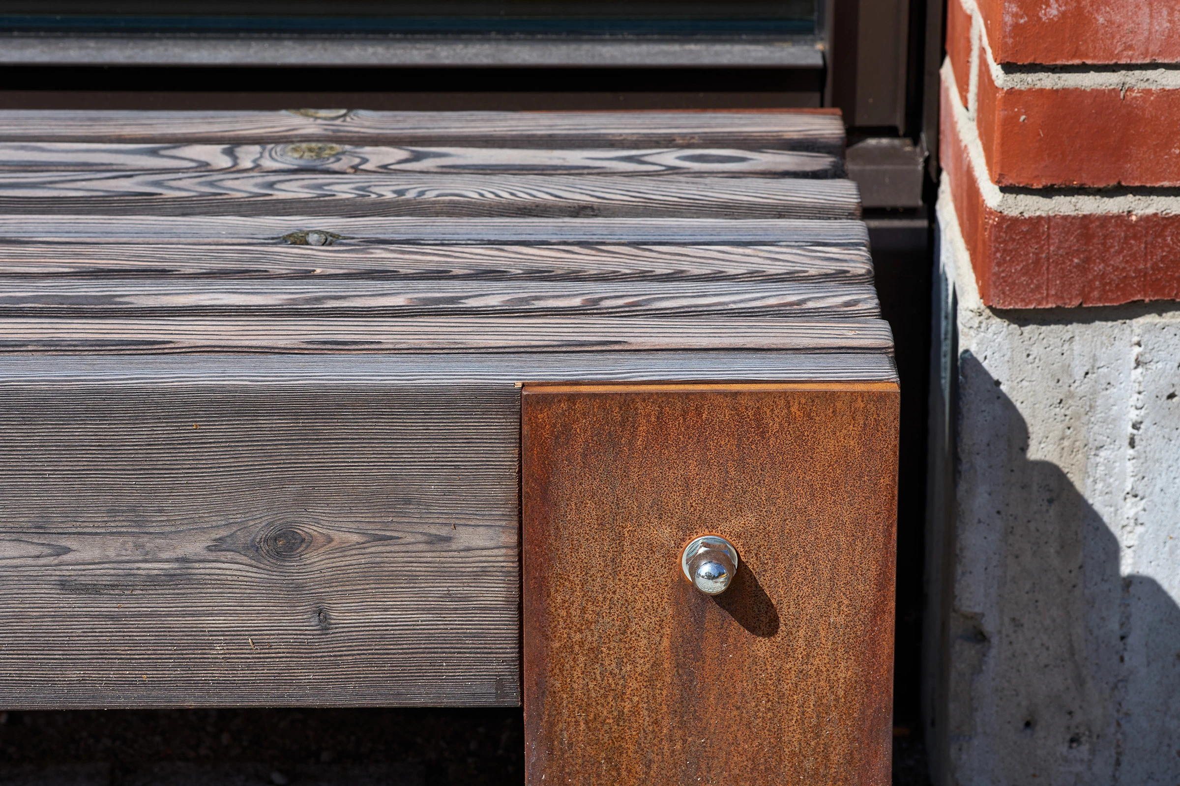 Rakenteessa kiinnostava osa on myös teräksen ja hiilletyn puun liitto. Teräksinen runko tuo penkkiin julkisen tilan vaatimaa jämäkkyyttä ja samalla se antaa puulle roolin päämateriaalina. Teräs hoitaa kantavuuden. Kiinnitysratkaisut, eli näkyvät pulttiliitokset ja päätylevyt, tekevät rakenteesta rehdin.
