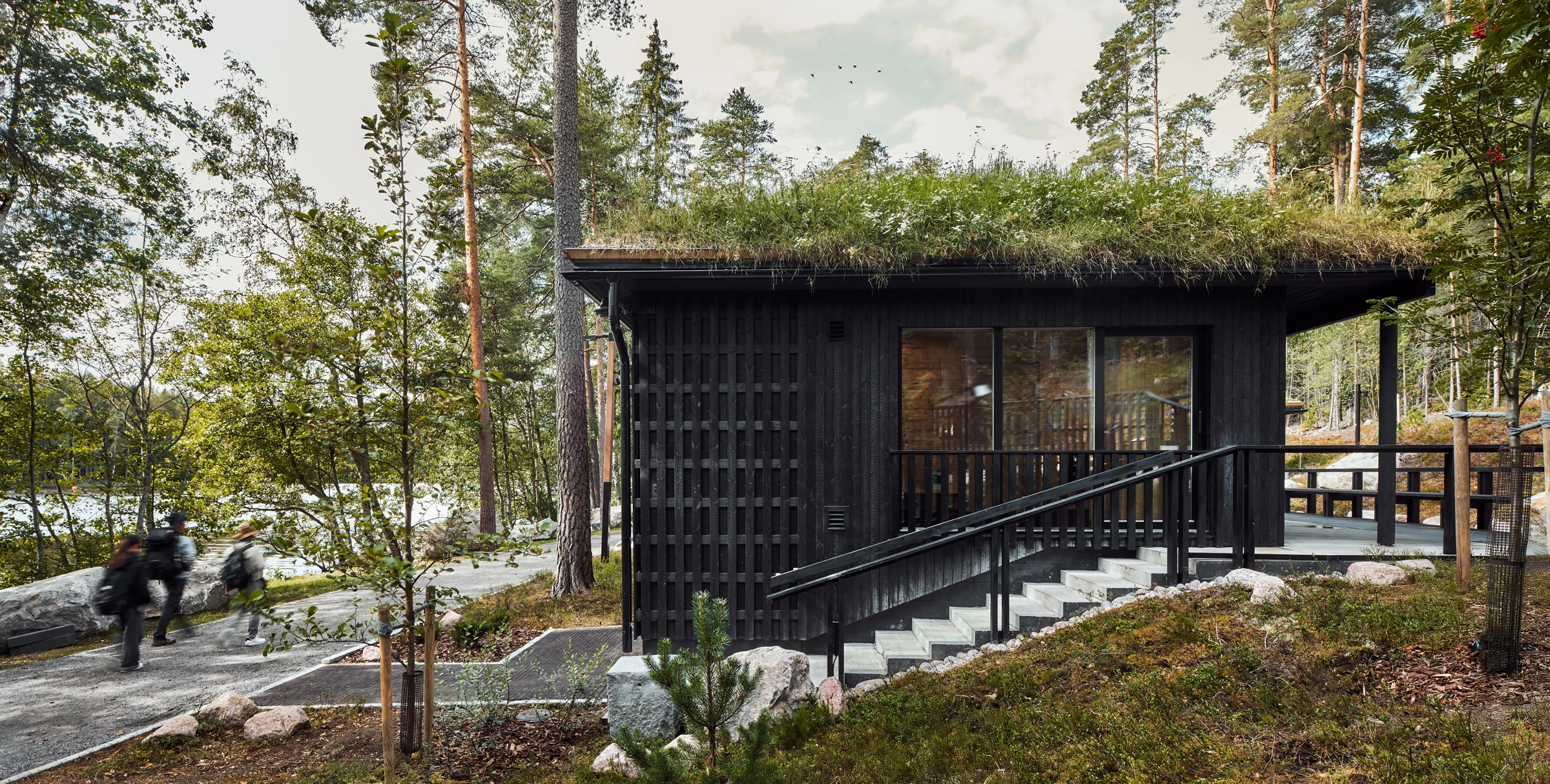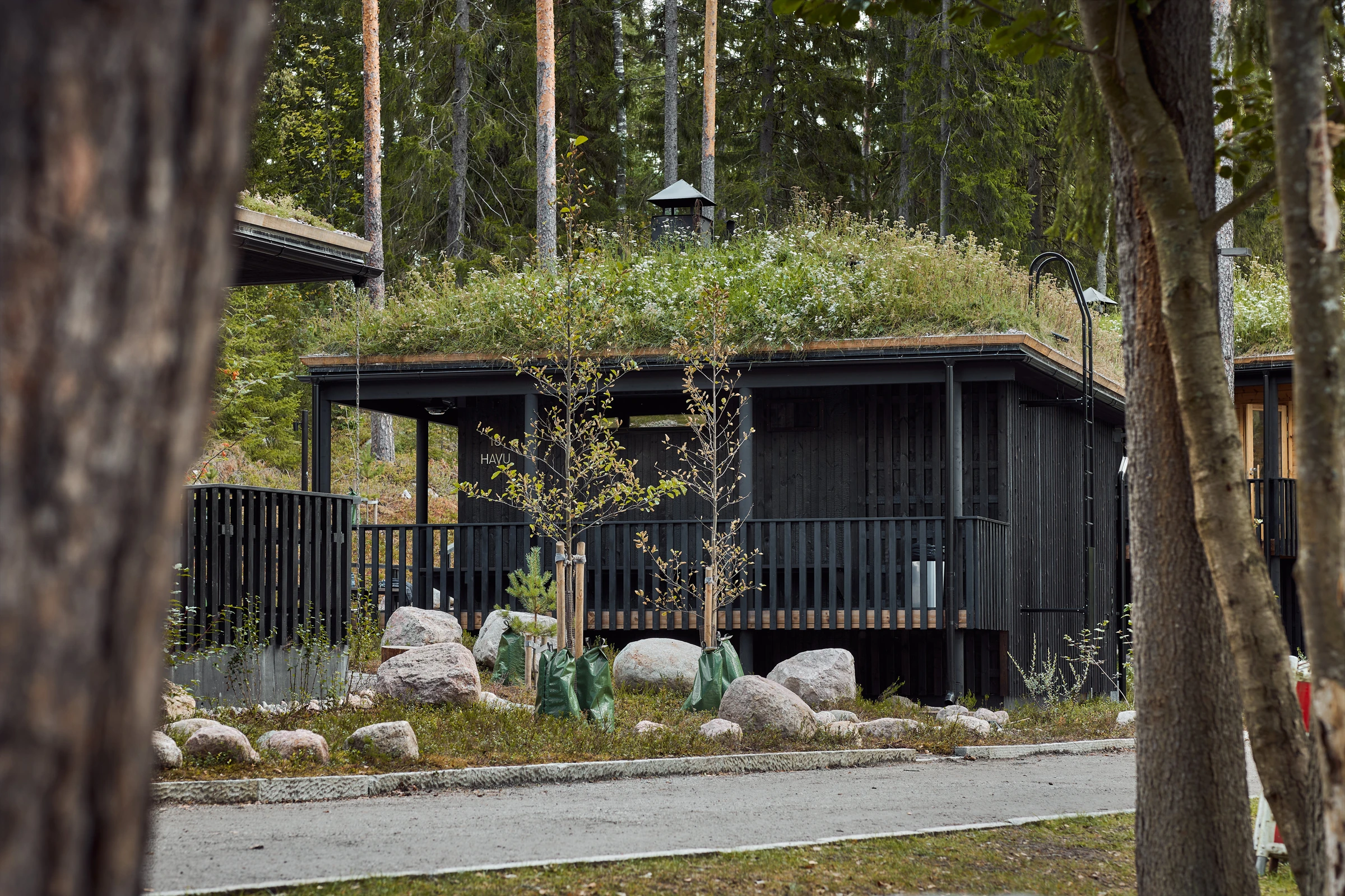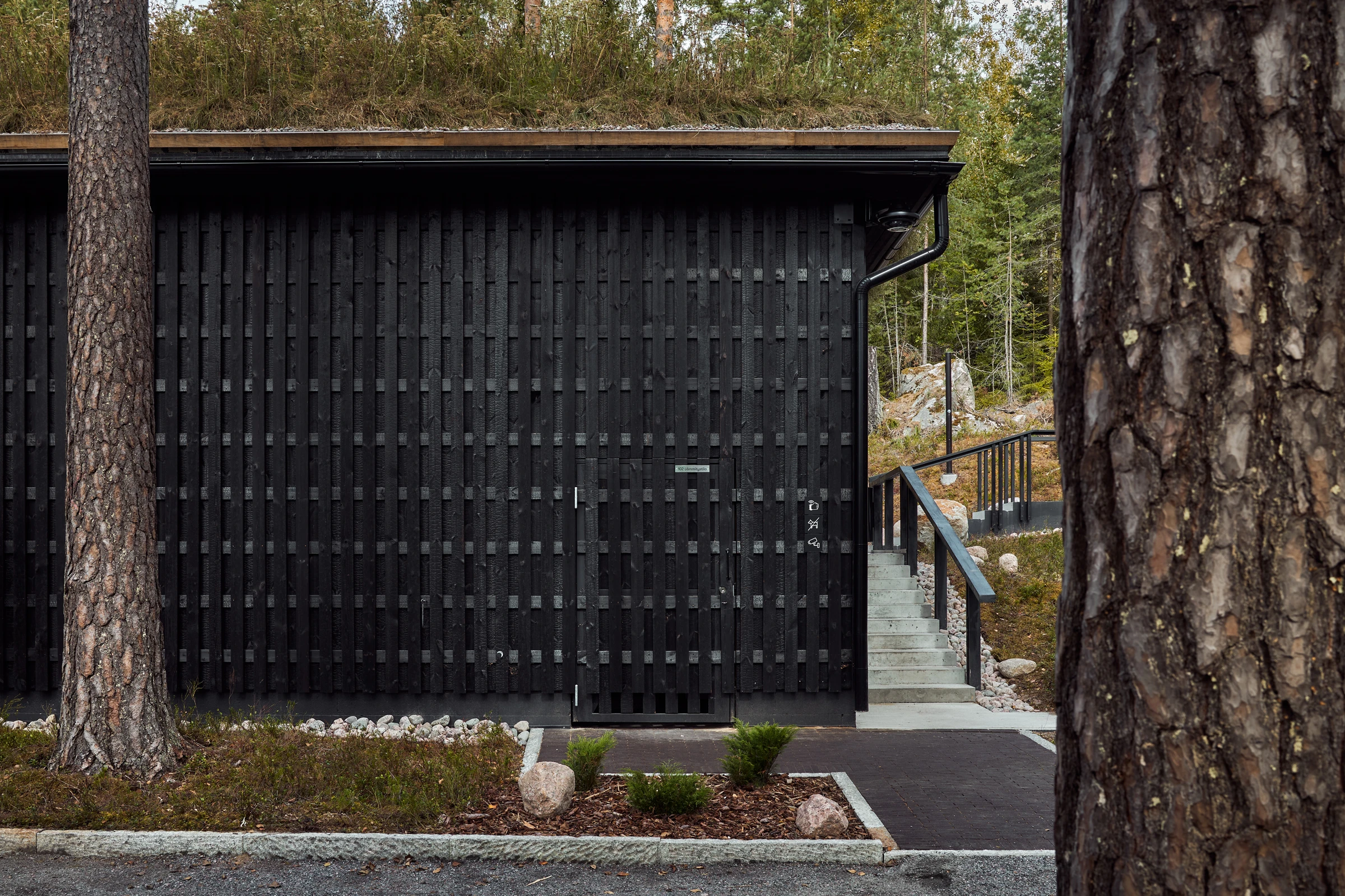 Kun rantaan toteutettiin uudet palvelurakennukset, eli kaksi uutta savusaunaa sekä puku-, pesu- ja infotoimintoja, tavoitteena ei ollut rakentaa uutta nähtävyyttä, vaan täydentää kokonaisuutta niin, että uusi tuntuu siltä kuin se olisi ollut siellä aina. Rakennusten muotokieli ja materiaalit kytkevät ne maisemaan: hirsirunko, hiilletty verhous ja katot, jotka tuovat luonnon pintaa ja pehmeyttä arkkitehtuurin yli.