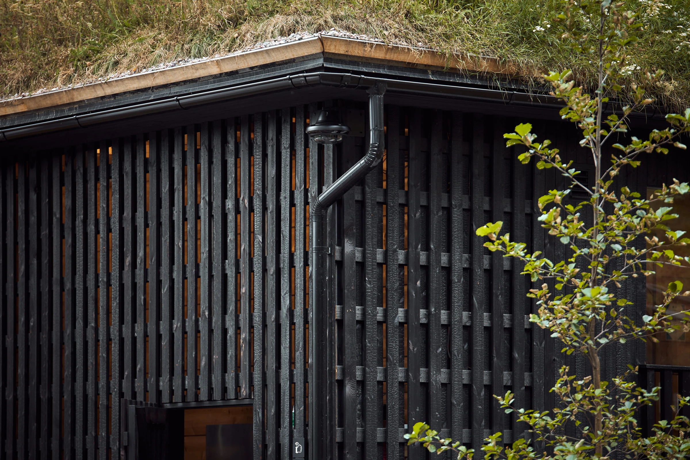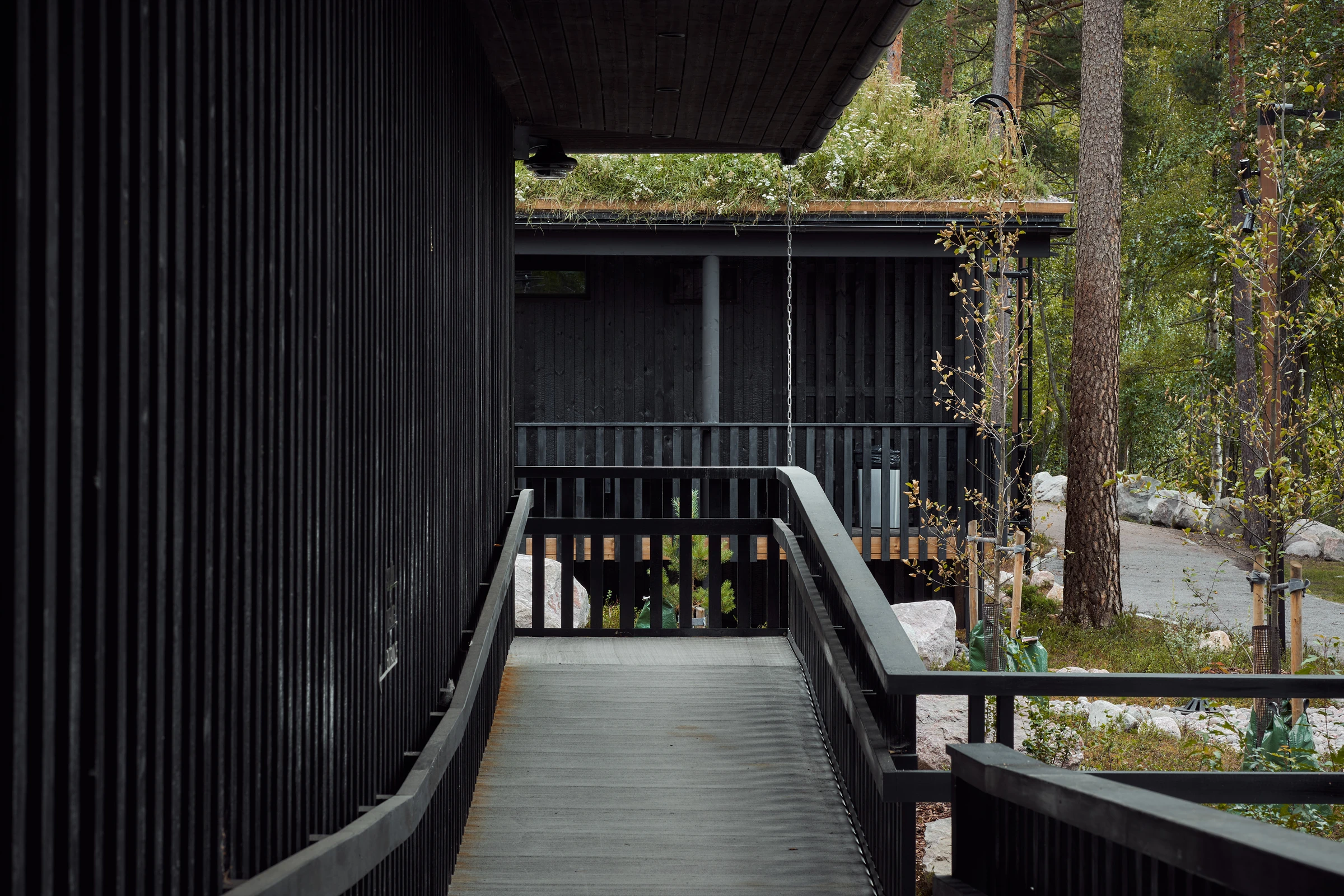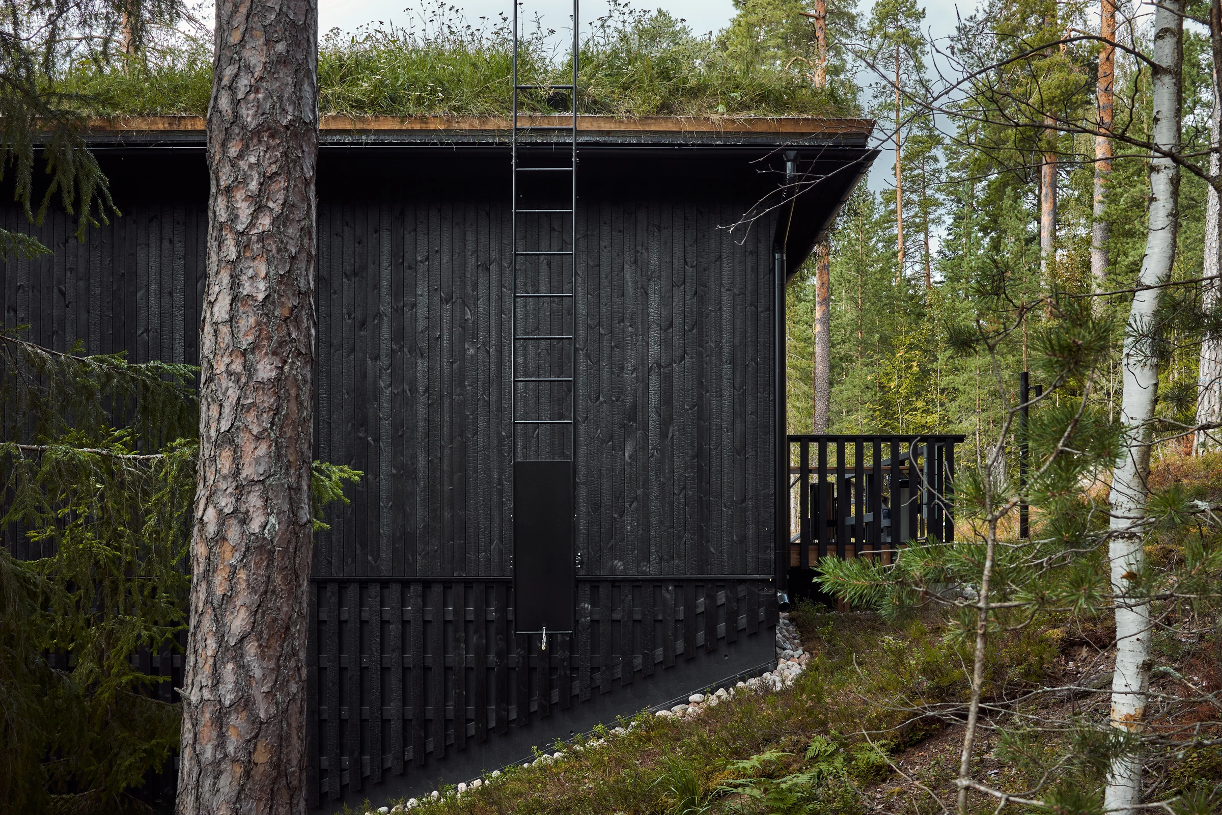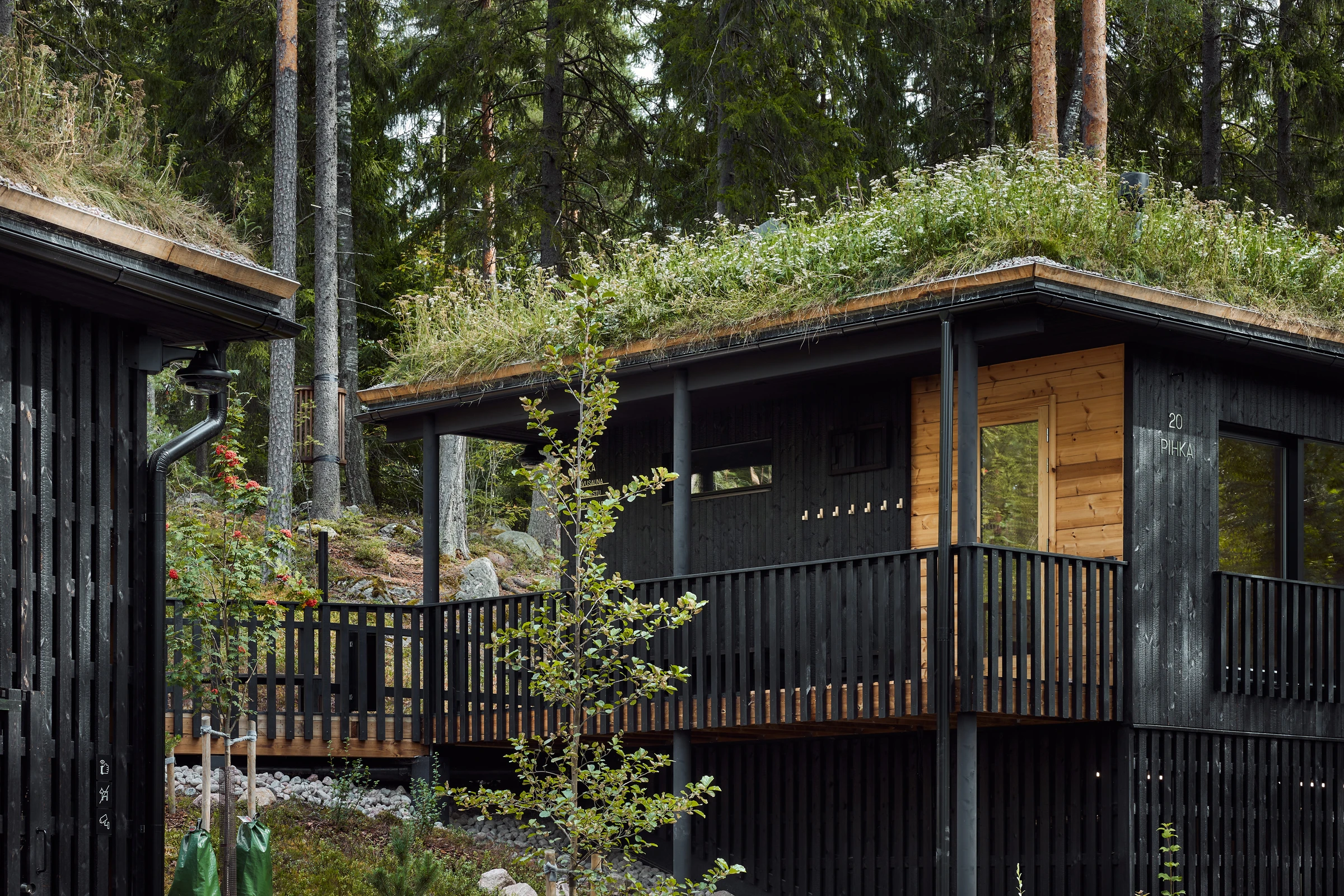 Kun rantaan toteutettiin uudet palvelurakennukset, eli kaksi uutta savusaunaa sekä puku-, pesu- ja infotoimintoja, tavoitteena ei ollut rakentaa uutta nähtävyyttä, vaan täydentää kokonaisuutta niin, että uusi tuntuu siltä kuin se olisi ollut siellä aina. Rakennusten muotokieli ja materiaalit kytkevät ne maisemaan: hirsirunko, hiilletty verhous ja katot, jotka tuovat luonnon pintaa ja pehmeyttä arkkitehtuurin yli.