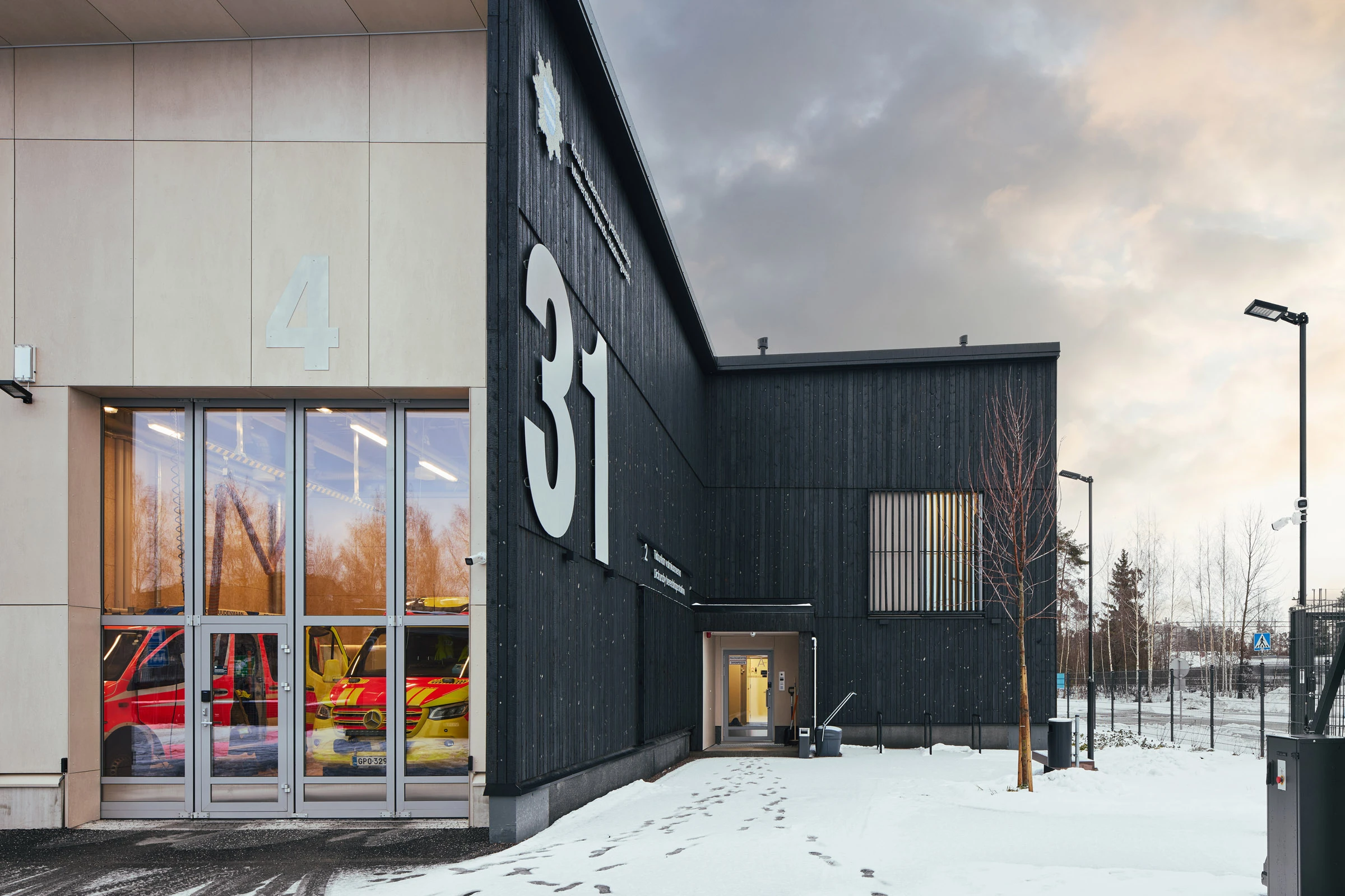 Julkisivu on mustaa puuta, ja materiaalivalinta on kiinnostava jo ajatuksena. Paloasema rakennuksessa, jonka näkyvin pinta on poltettu. Tässä se ei kuitenkaan ole ristiriita, vaan hallittu ja tarkoituksellinen ratkaisu. Hiilletty puuverhous tuo rakennukselle rauhallisen, tunnistettavan ilmeen, ja samalla se kertoo pintojen elinkaaren logiikasta.