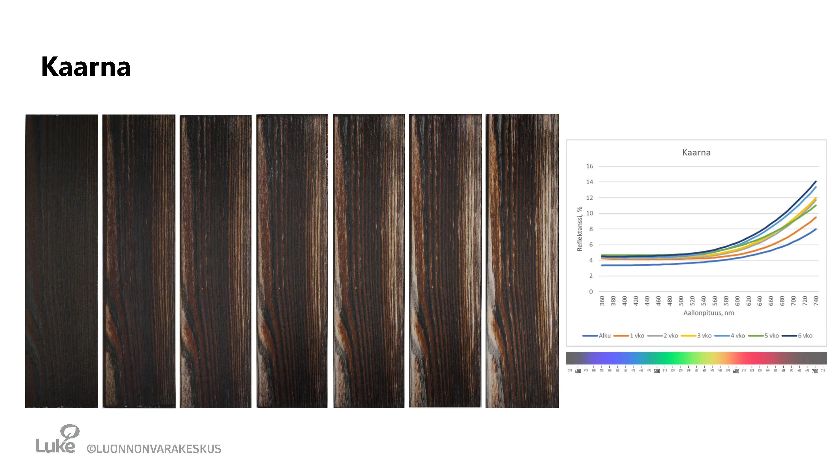 Säärasitustestin sääkaappiohjelma: 102 min UV-käsittelyä ja 18 min UV+sadetus -käsittelyä, jota toistettiin 6 viikon ajan (1008 h). Vastaavuus: Käsittelyn voi olettaa vastaavan noin 3 vuoden rasitusta ulkoilmassa sateelle ja auringonpaisteelle alttiina. Testiin UV-säteilyannos oli noin 218 MJ/m2.