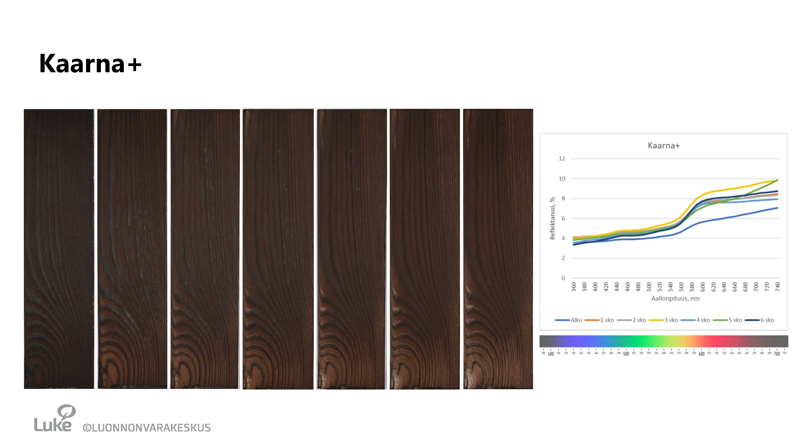 Kaarna+ on tumman ruskealla sävyaineella käsitelty hiilletty ja harjattu puutuote. Sävyaineen ansiosta tuote ei harmaannu yhtä voimakkaasti kuin Kaarna.