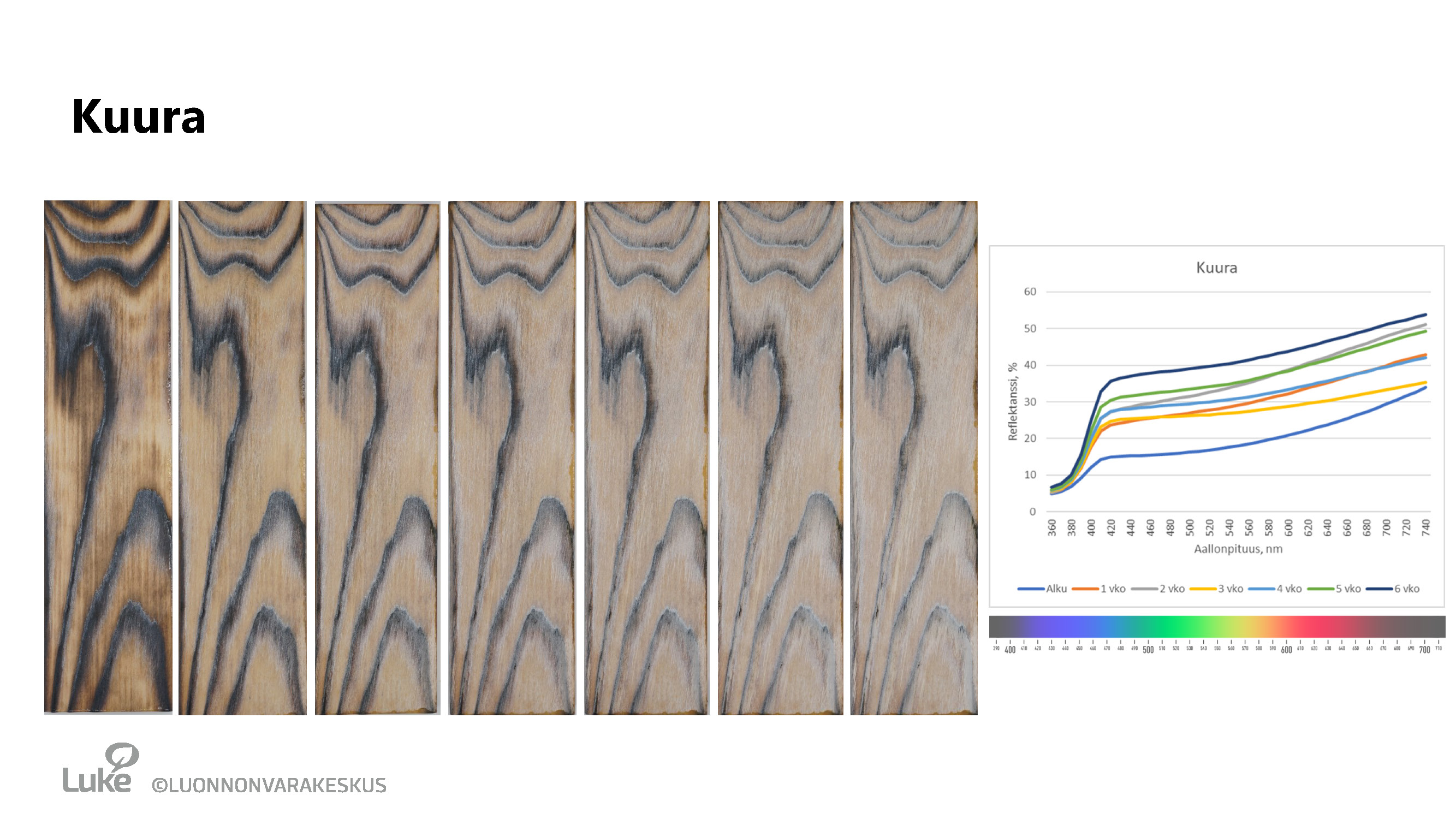 Säärasitustestin sääkaappiohjelma: 102 min UV-käsittelyä ja 18 min UV+sadetus -käsittelyä, jota toistettiin 6 viikon ajan (1008 h). Vastaavuus: Käsittelyn voi olettaa vastaavan noin 3 vuoden rasitusta ulkoilmassa sateelle ja auringonpaisteelle alttiina. Testiin UV-säteilyannos oli noin 218 MJ/m2.