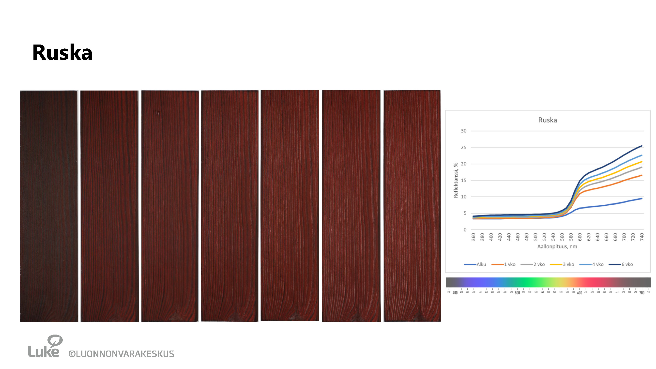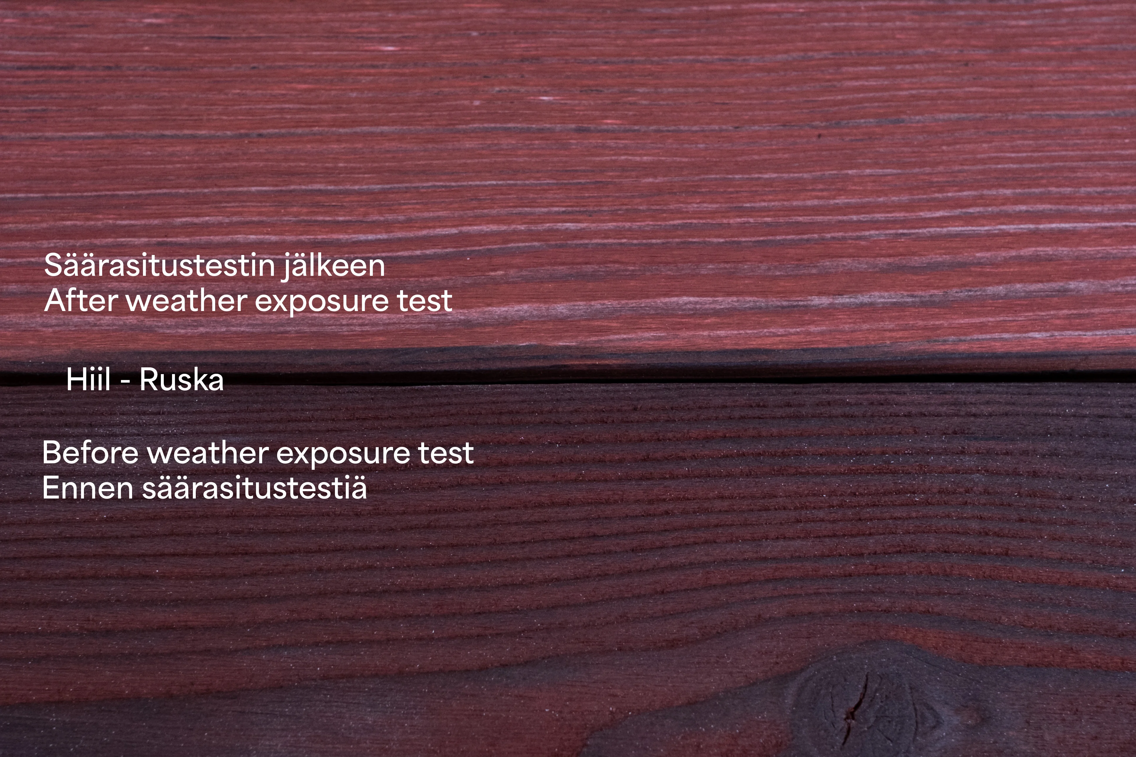 Säärasitustestin sääkaappiohjelma: 102 min UV-käsittelyä ja 18 min UV+sadetus -käsittelyä, jota toistettiin 6 viikon ajan (1008 h). Vastaavuus: Käsittelyn voi olettaa vastaavan noin 3 vuoden rasitusta ulkoilmassa sateelle ja auringonpaisteelle alttiina. Testiin UV-säteilyannos oli noin 218 MJ/m2.